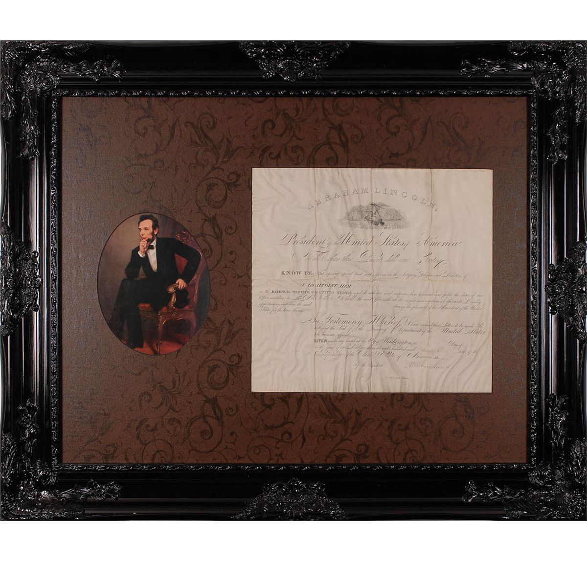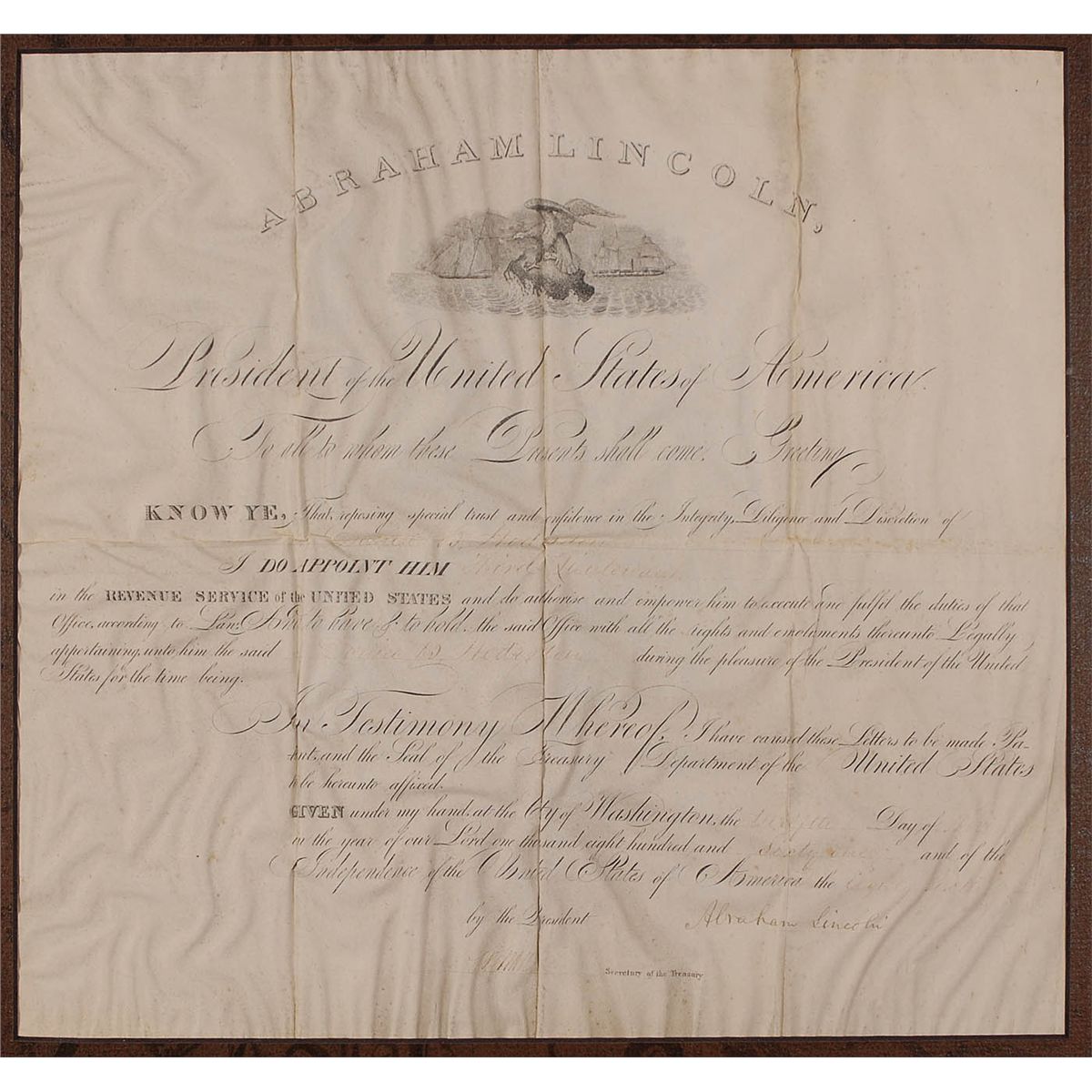 Partly-printed war-dated DS as president, one page, 14 x 13.25, November 12, 1861. President Lincoln appoints David Hodgson a “Third Lieutenant in the Revenue Service of the United States.” Signed at the conclusion by Lincoln and countersigned by Secretary of the Treasury Salmon P. Chase. Matted and framed with a color portrait of Lincoln to an overall size of 34 x 28.25. Intersecting folds, one through a single letter of signature, moderate rippling from moisture exposure, handwritten portions of the document fairly light, but still mostly legible, and some scattered light toning and soiling, otherwise very good condition. Lincoln’s signature remains quite crisp and prominent. Accompanied by a full letter of authenticity from PSA/DNA. Oversized.