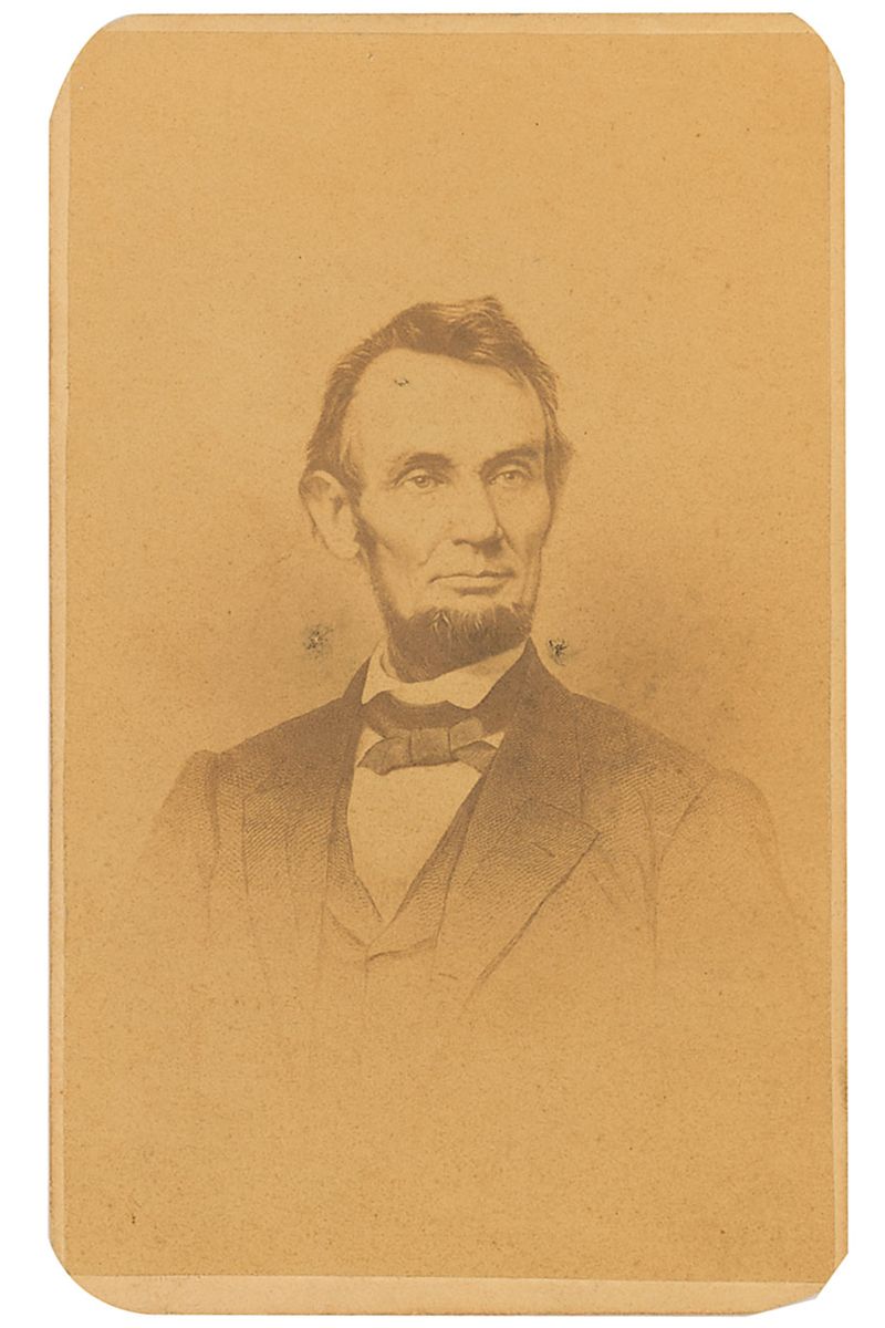 Unsigned original 2.5 x 4 carte-de-visite of an engraved bust portrait of Lincoln, by an anonymous studio, captioned on the reverse: “Abraham Lincoln, Late President of the United States.” Light scattered soiling, the image slightly faded, and clipped cor
