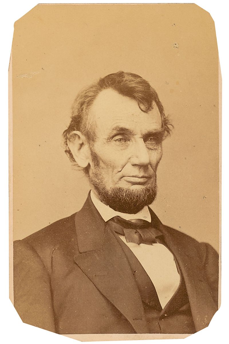 Unsigned original 2.25 x 3.5 carte-de-visite portrait of Lincoln, by Brady’s National Portrait Gallery of Washington. A light surface ding to the upper left and irregularly trimmed edges, otherwise fine condition.