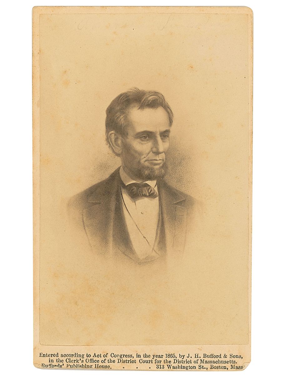 Unsigned original 2.5 x 4 carte-de-visite illustrated bust portrait of Lincoln, by J. H. Bufford & Sons of Boston circa 1865. Scattered foxing to the image and a lightly trimmed bottom edge, otherwise fine condition.