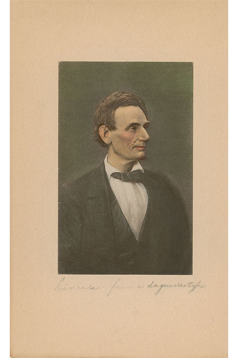 Uncommon hand-colored matte-finish 3.5 x 5.5 photo of Lincoln affixed to an off-white 5.75 x 9.25 mount, labeled below the image in pencil, “Lincoln from a daguerreotype.” In fine condition, with a trimmed right edge and some mild toning to the mount.