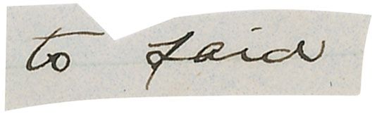 Two words in Lincoln’s hand, “to said,” on an off-white 1.25 x .25 slip clipped from a larger document. In fine condition. Accompanied by a photocopy of the original document from which the words were removed and a modern Upper Deck trading card of Lincol