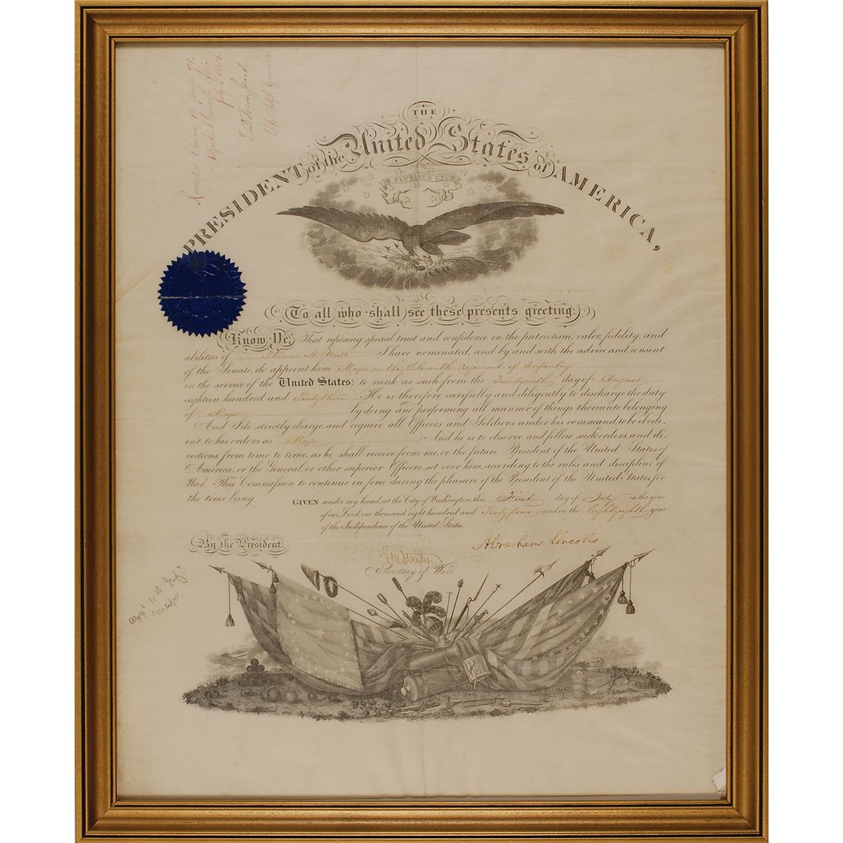 War-dated partly-printed DS as president, one page, 15.25 x 19, July 1, 1864. President Lincoln appoints Thomas H. Neill a “Major in the Eleventh regiment of Infantry in the service of the United States.” Signed at the conclusion by Lincoln, and countersigned by Secretary of War Edwin Stanton. Framed to an overall size of 17.25 x 21. Intersecting folds, with a horizontal fold passing through a few portions of signature, some light toning, a pencil notation to lower left, and a trivial bit of paper loss to lower right corner, otherwise fine condition. The blue seal is crisp and bright, with a horizontal fold through the center.