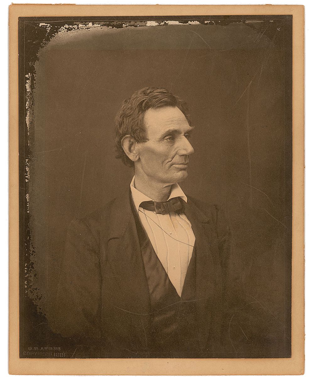 Desirable mounted photograph of Lincoln in profile, 7.75 x 9.5, printed by George B. Ayres circa 1890 from the original negative taken by Alexander Hesler shot in Springfield, Illinois, in 1860. Affixed to a slightly larger mount, with a copyright credit on the reverse, “Copyright, Geo. B. Ayres, Phila,” and a “G. E. Ayres, Copyright 1881,” photographer’s stamp to lower left corner. Somewhat noticeable surface marks, otherwise fine condition. One of Lincoln’s best portraits, his law partner William Herndon called this pose ‘so essentially Lincolnian; no other artist has ever caught it.’