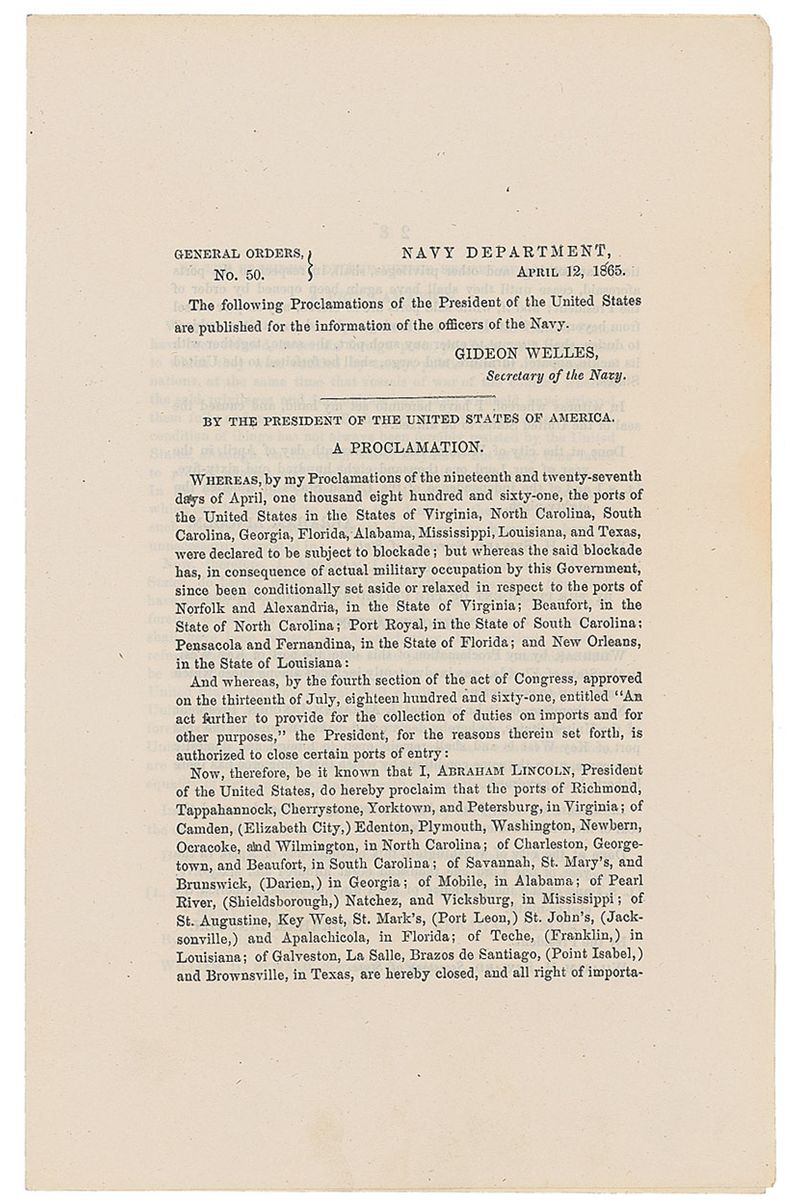 Original printed proclamation, with Lincoln’s name printed at the conclusion, 5.5 x 8.5, three pages on two adjoining sheets, dated April 12, 1865. Three presidential proclamations, titled “General Orders No. 50,” concerning military blockades, the collection of duties on imports, the correction of Key West’s status as an open port to commerce, and the privileges and immunity of vessels of war. In fine condition.