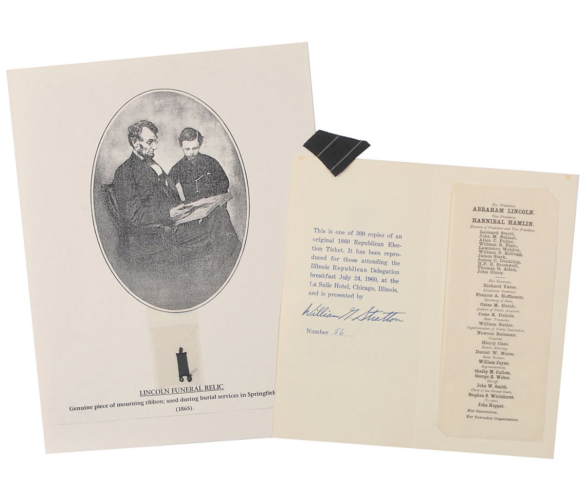 Three original relics associated with Abraham Lincoln: small clipped piece of black mourning ribbon used during Lincoln’s burial service in Springfield, Illinois; a small clipped swatch of black and white striped material from one of Mary Todd Lincoln’s dresses, originally from the John Lattimer Collection; and a limited edition presentation of an 1860 Republican election ticket. In fine condition.