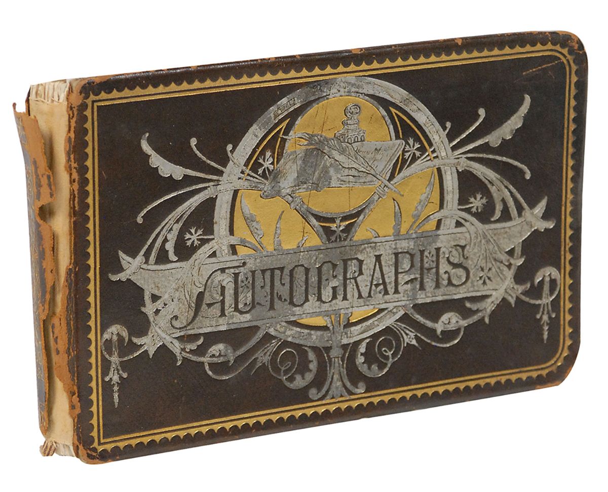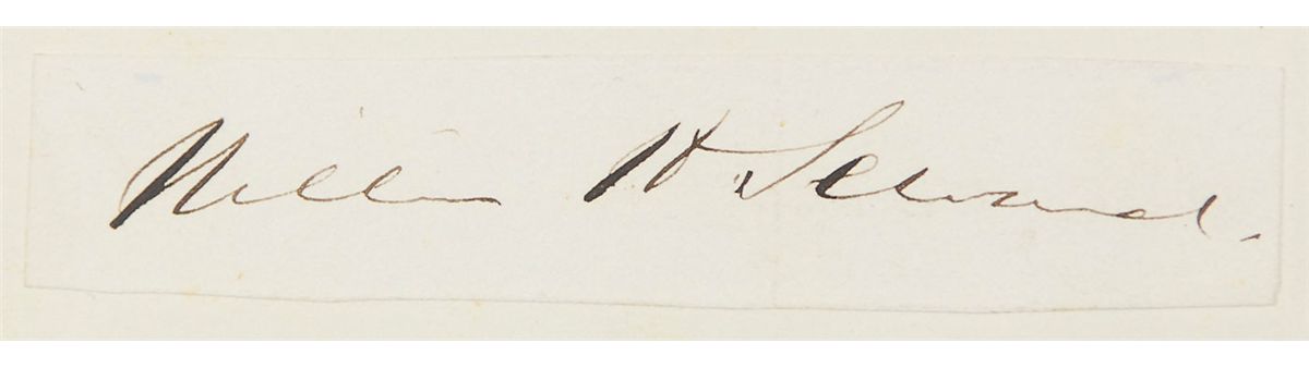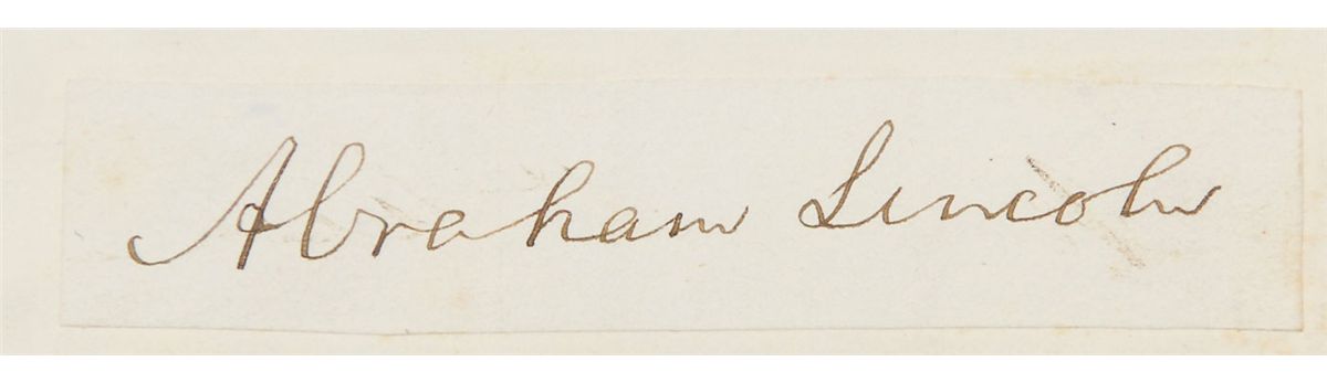 Bold ink signature, ostensibly as president, “Abraham Lincoln,” on an off-white 3.75 x .75 slip affixed inside an autograph book. Affixed to the opposite page is an equally bold ink signature of Secretary of State William H. Seward; these are believed to have been clipped from the same postmaster appointment document. The autograph album belonged to N. K. Noble, who served as postmaster of Cambridge East for a decade after a stint in the Massachusetts state legislature. Other signers within the book number approximately 55, and consist of various friends, family, and local officials, including members of the Noble family, and a secretarial signature of Andrew Johnson. In overall fine condition, with subtle vertical folds passing through signatures and mild ink transfer to the Lincoln slip. This is an exceptional example of a presidential Lincoln autograph—he generally signed using just his first initial except for on official documents, making full signatures such as this quite scarce. It is also as strong and bold as the day it was signed, having been well preserved in this autograph book for over a century.