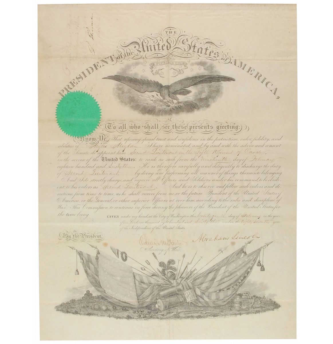Partly-printed DS as president, one page, 14 x 18, February 24, 1863. President Lincoln appoints Myles Moylan “a Second Lieutenant in the Fifth Regiment of Cavalry in the service of the United States.” Signed at the conclusion by Lincoln and countersigned by Secretary of War Edwin M. Stanton. Document is affixed by its top edge to a 15.5 x 11.5 off-white sheet. In fine condition, with intersecting folds, with a horizontal fold touching bottom of Lincoln’s signature, some scattered light toning and soiling, and a couple of trivial spots. The green seal is worn, but intact. Moylan enlisted in 1857 with the 2nd US Dragoons, and commanded a company during the battles of Shiloh and Corinth, with his company also serving as an escort for General Grant. After his promotion, he assumed command of Company D, which fought with distinction at Brandy Station, Gettysburg, Manassas Gap, and Front Royal. After the war, he would serve with General George Custer in the 7th Cavalry, and receive the Medal of Honor for his gallantry in action at Bear Paw Mountain, Montana, on September 30, 1877, against Nez Perce Indians.