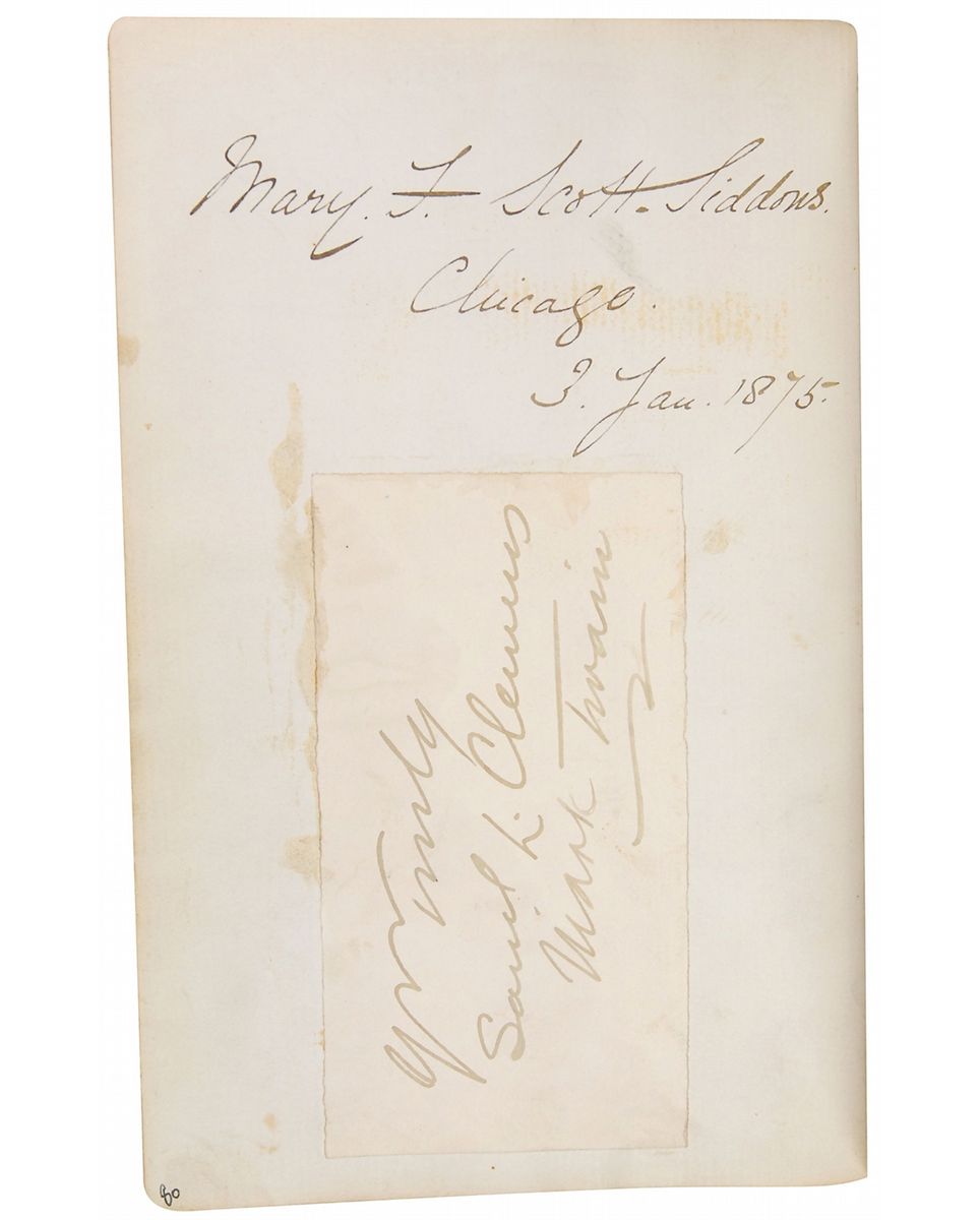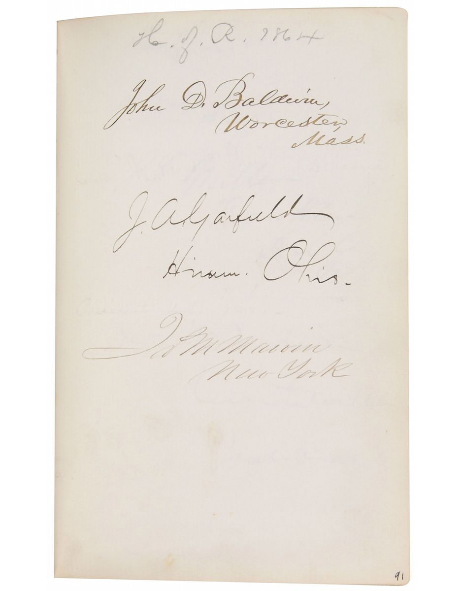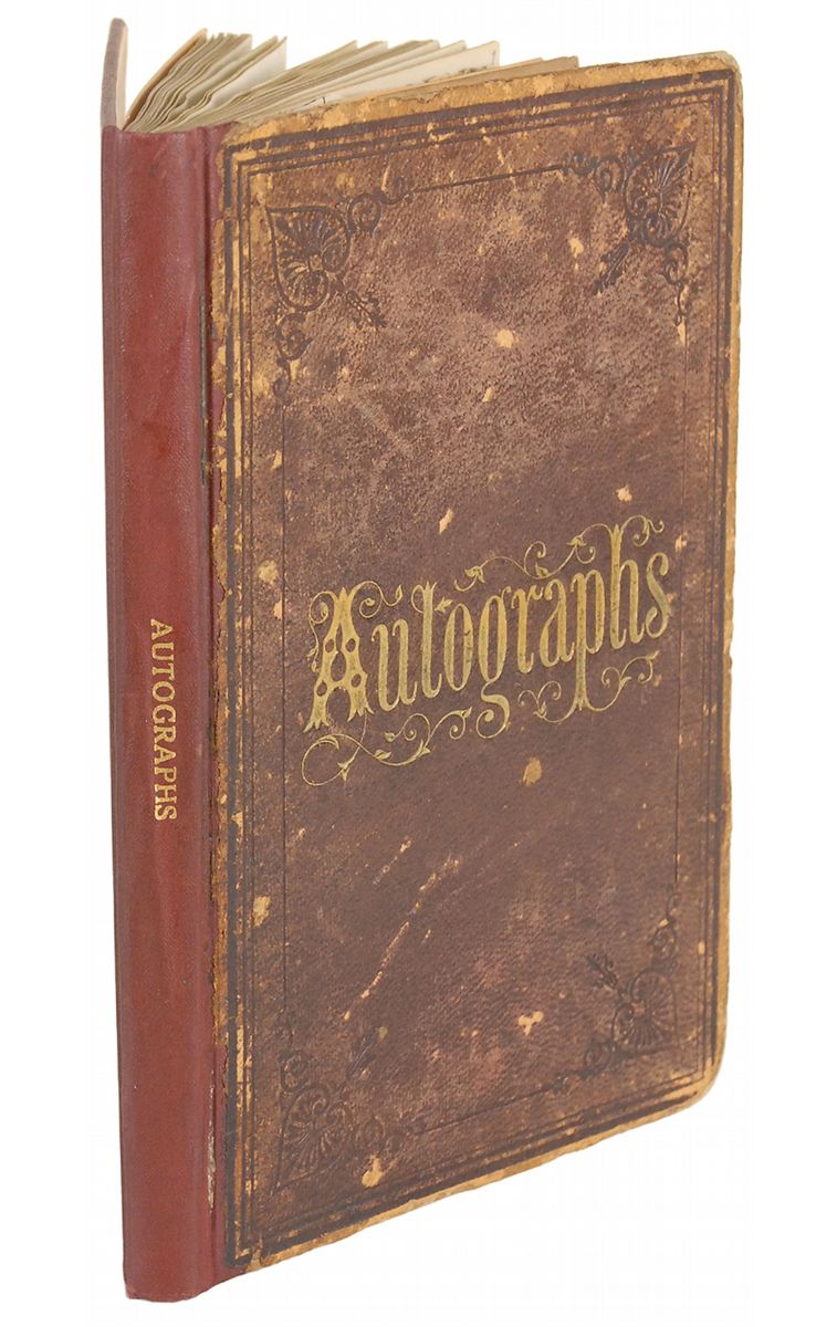 Hardcover autograph album, 5.75 x 9, with 181 signatures inside, with a few single-page signatures, some signatures on affixed clipped slips, and some back-to-back signatures as well. Signers include: Abraham Lincoln (as president), Edwin M. Stanton, James G. Blaine, Charles Sumner, Schuyler Colfax, Charlotte Cushman, Samuel L. Clemens (signing “Yours truly, Samuel L. Clemens, Mark Twain”), James A. Garfield, Salmon P. Chase, Gideon Welles, Thomas A. Hendricks, Henry Wilson, John Sherman, A. Bronson Alcott, and many members of the 1864 Senate and House of Representatives. In very good condition, with scattered toning and edge wear to pages, restored spine, and moderate wear to covers. A meticulous collection boasting some of the most important Civil War decision-makers.