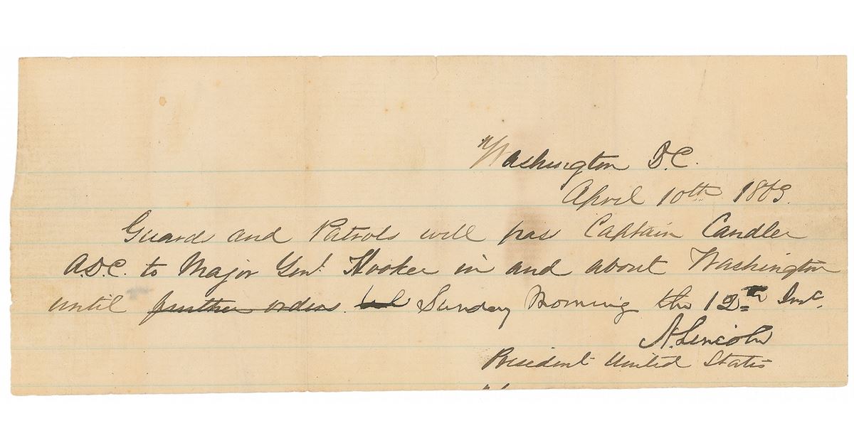 Civil War–dated manuscript DS as president, signed “A. Lincoln,” one page, lightly-lined, 7.5 x 3, April 10, 1863. In full: “Guard and Patrols will pass Captain Candler A.D.C. to Major Genl. Hooker in and about Washington until further order.” Lincoln has crossed out “further order” and written more specifically, “Sunday Morning the 12th Inst.” Intersecting folds (a few vertical folds unobtrusively passing through letters of the signature), scattered creases, and light soiling, otherwise fine condition.