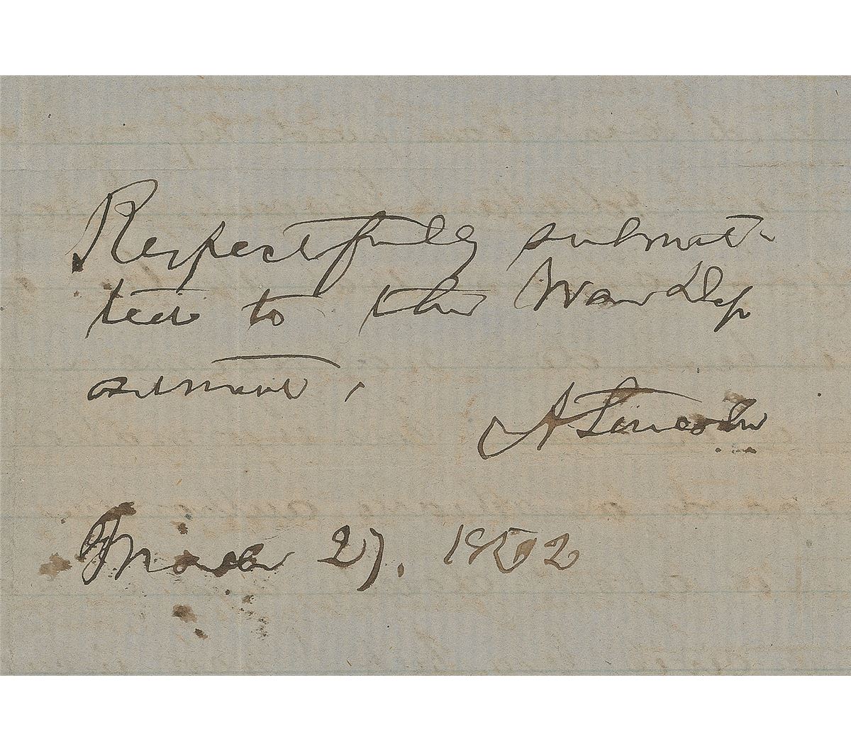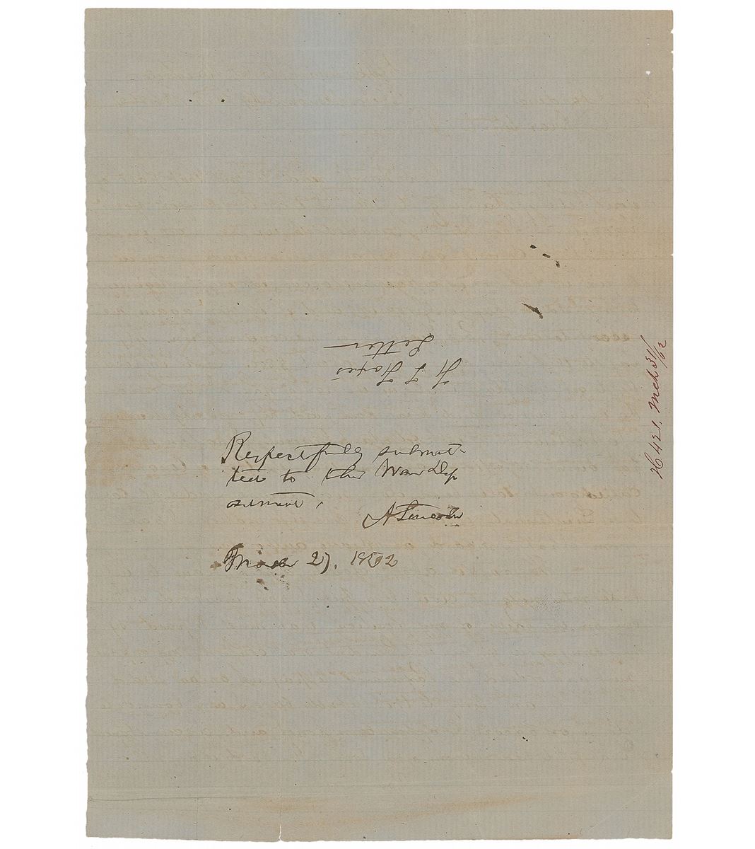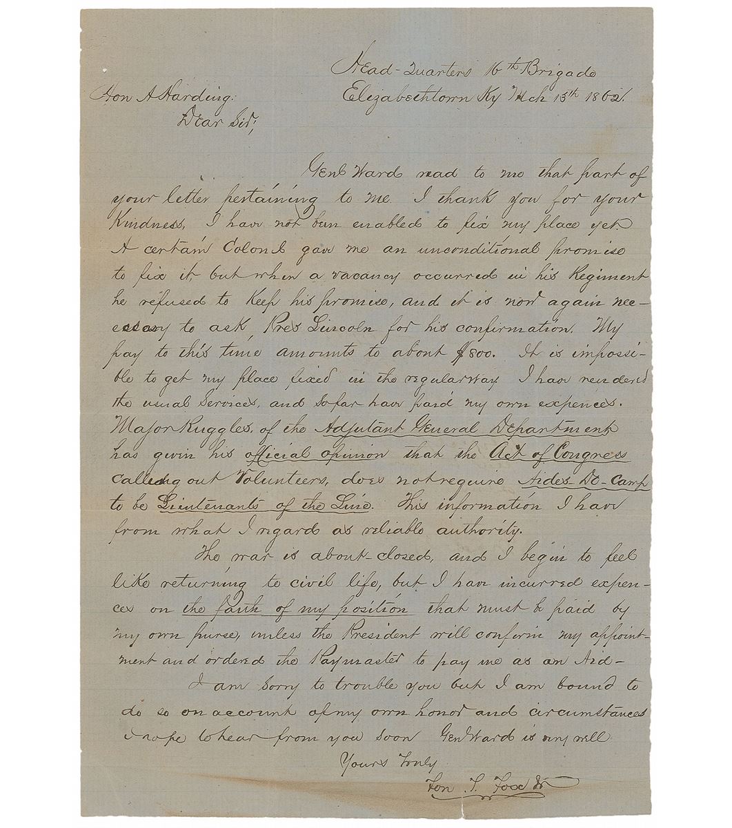 War-dated handwritten endorsement, signed as president, “Respectfully submitted to the War Department, A. Lincoln, March 27, 1862,” on the reverse of a lightly-lined one-page 7.5 x 10.5 ALS from Kentuckian Fontaine T. Fox, Jr., to Kentucky Unionist Congressman Aaron Harding. Fox writes, in full: “Genl Ward read to me that part of your letter pertaining to me. I thank you for your kindness. I have not been enabled to fix my place yet. A certain Colonel gave me an unconditional promise to fix it, but when a vacancy occurred in his Regiment he refused to keep his promise, and it is now again necessary to ask Pres Lincoln for his confirmation. My pay to this time amounts to about $800. It is impossible to get my place fixed in the regular way. I have rendered the usual Services and so far have paid my own expences. Major Ruggles of the Adjutant General Department has given his official opinion that the Act of Congress calling out Volunteers, does not require Aides-De-Camp to be Lieutenants of the Line. This information I have from what I regard as reliable authority. The war is about closed, and I begin to feel like returning to civil life, but I have incurred expences on the faith of my position that must be paid by my own purse, unless the President will confirm my appointment and order the Paymaster to pay me as an Aid[e]. I am sorry to trouble you but I am bound to do so on account of my own honor and circumstances. I hope to hear from you soon. Genl Ward is very well.” In very good to fine condition, with intersecting folds, scattered creasing, two small tears along the bottom, and areas of scattered toning, one of which passes through Lincoln’s unusually rapid and slightly brushed signature. Accompanied by a full letter of authenticity from PSA/DNA.