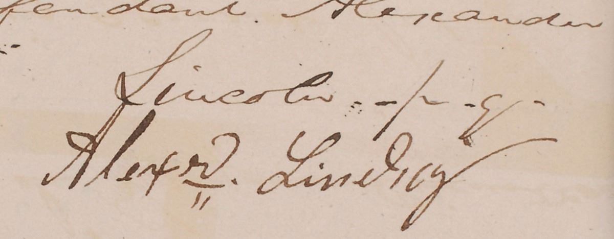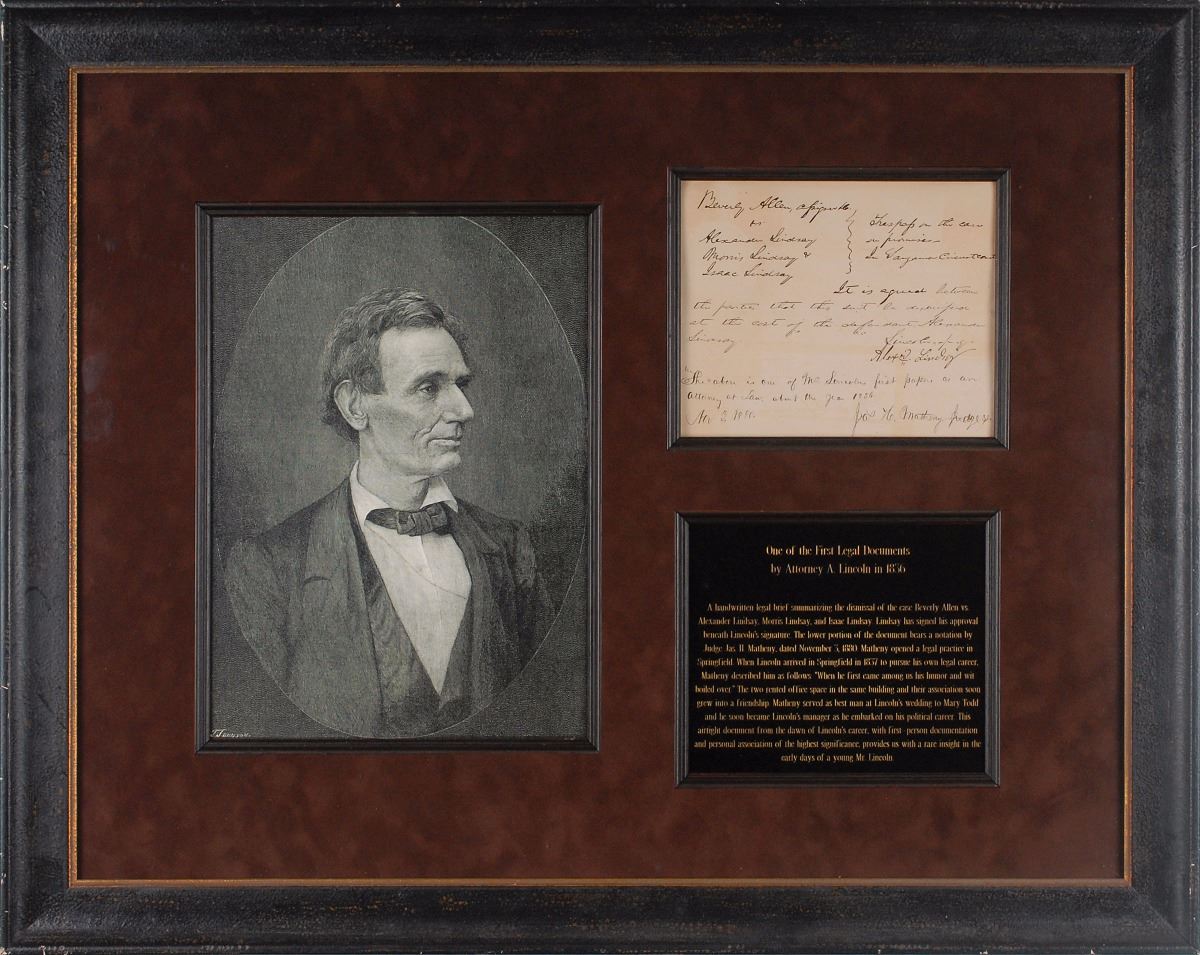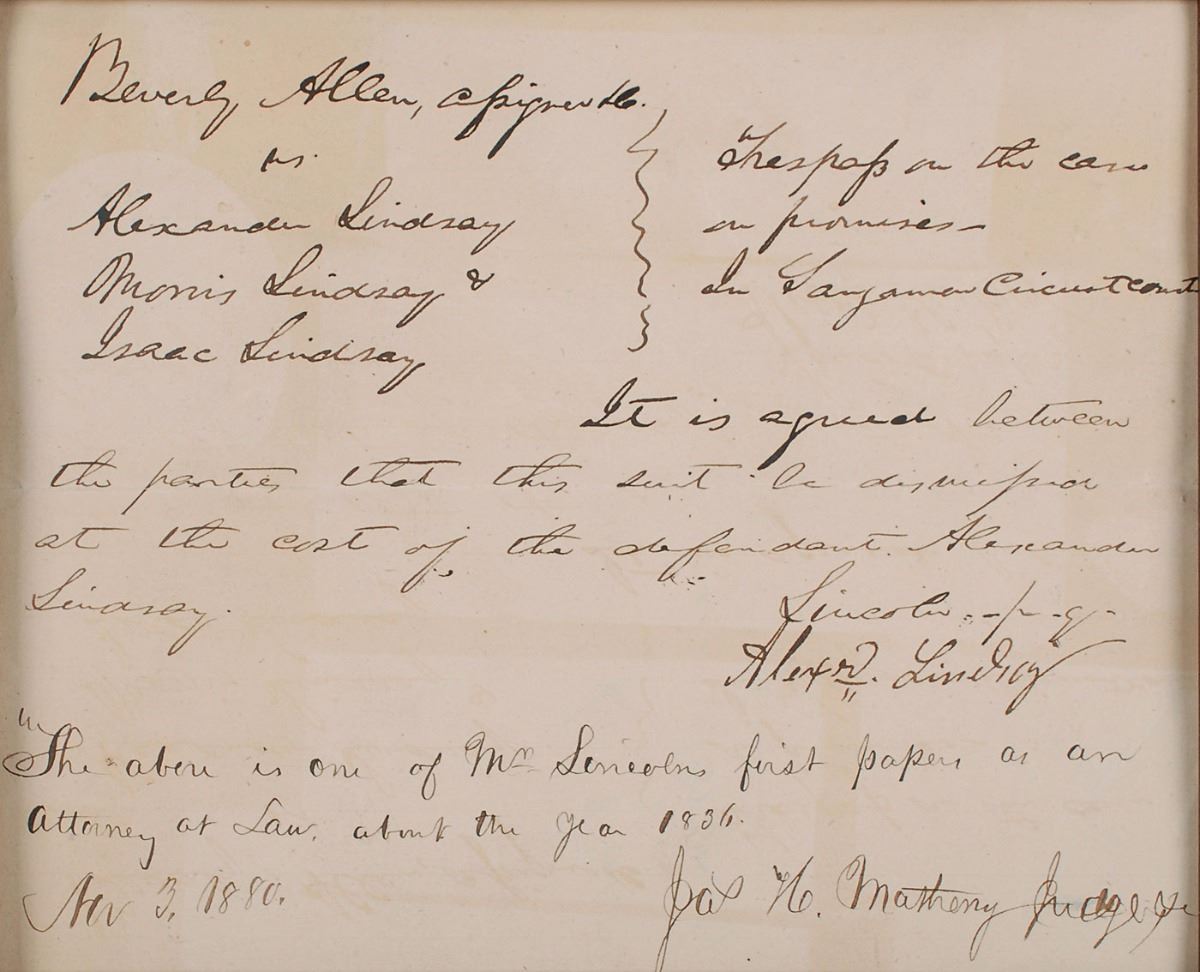 ADS, signed “Lincoln,” one page, 7 x 5.5, no date. A handwritten legal brief summarizing the dismissal of a case brought by Beverly Allen against three members of the Lindsay family for trespassing. The body of the document, in full: “It is agreed between the parties that this suit be dismissed at the cost of the defendant, Alexander Lindsay.” Signed at the conclusion by Lincoln and countersigned by Lindsay. Below, a signed lower portion of the document bears an ink notation in another hand, signed “Jas. H. Matheny, Judge,” dated November 3, 1880, and reading, “The above is one of Mr. Lincoln’s first papers as an attorney at law, about the year 1836.” Handsomely suede-matted and framed with a plaque and large portrait to an overall size of 26 x 21. In fine condition, with light irregular toning.