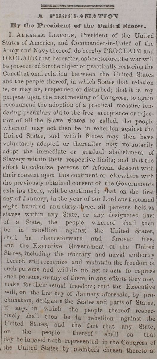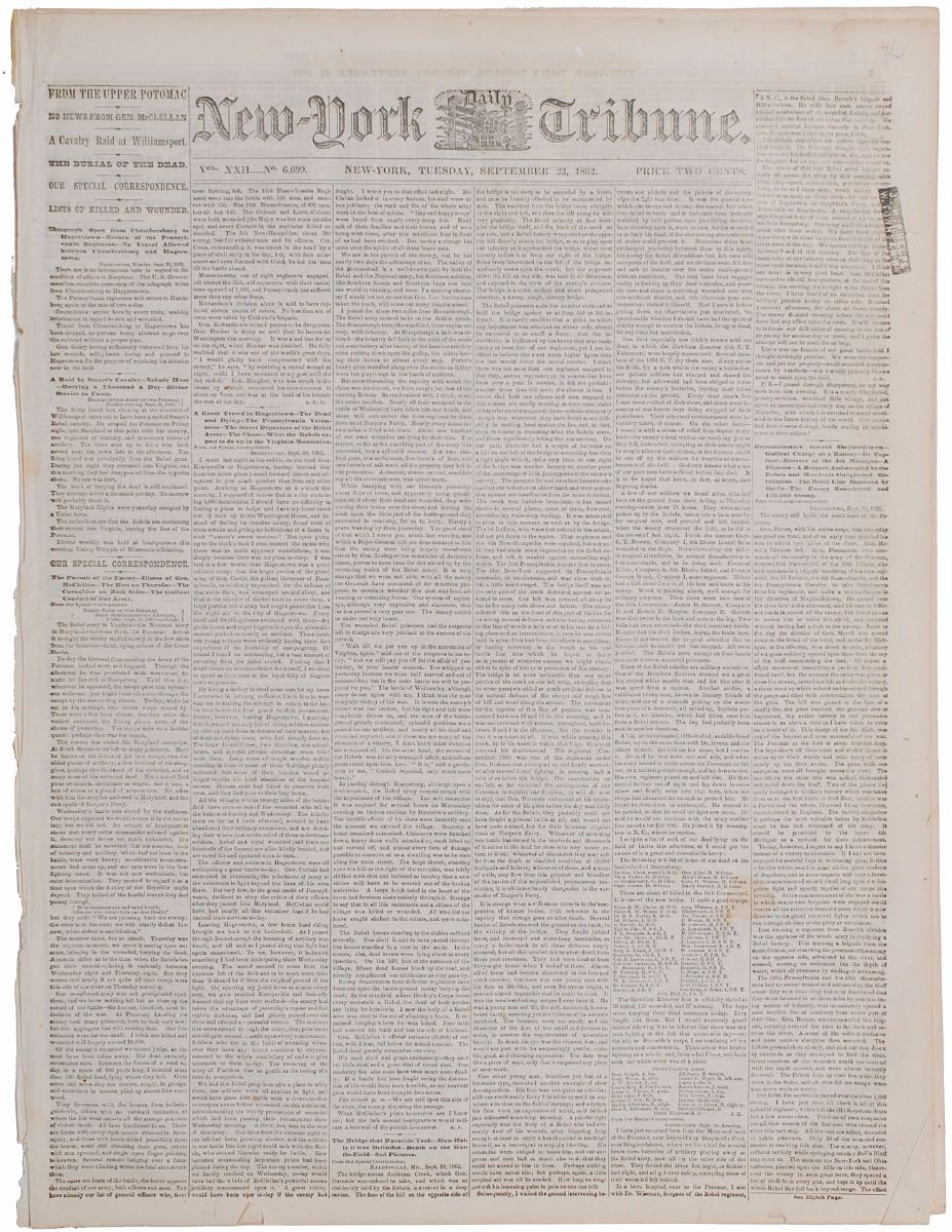 Issue of the New York Tribune from September 23, 1862, eight pages, 15.5 x 20.5, featuring one of the earliest printings of the Emancipation Proclamation on page four. In a preceding editorial, Horace Greeley comments, “It is the beginning of the end of the rebellion; the beginning of the new life of the nation. God bless Abraham Lincoln!” Other news includes updates on the Civil War, mentioning Stonewall Jackson, Munfordsville, and J. E. B. Stuart. In fine condition, with an ownership stamp to the right margin of the first page.