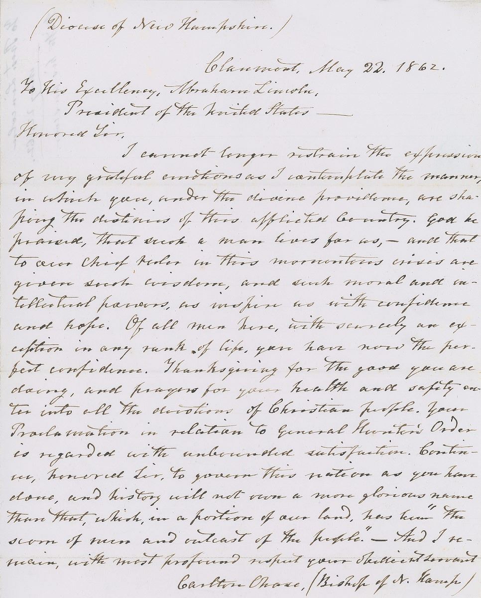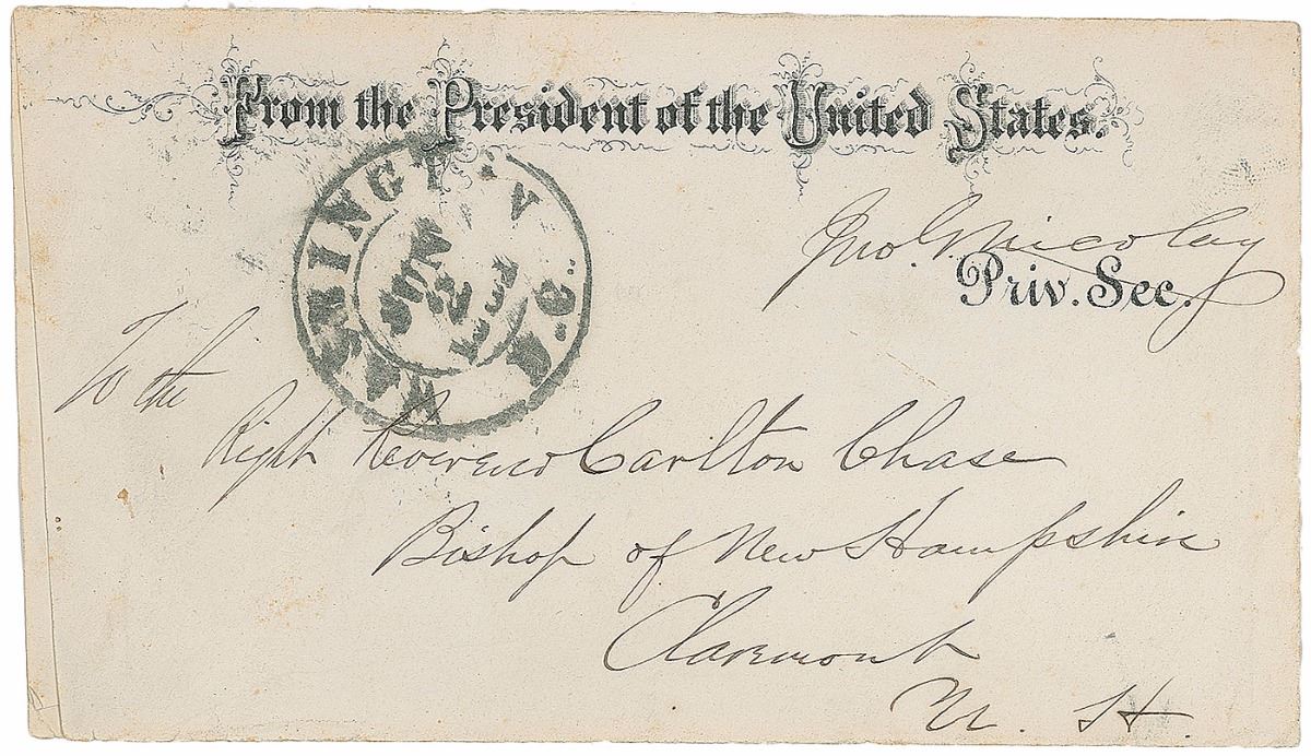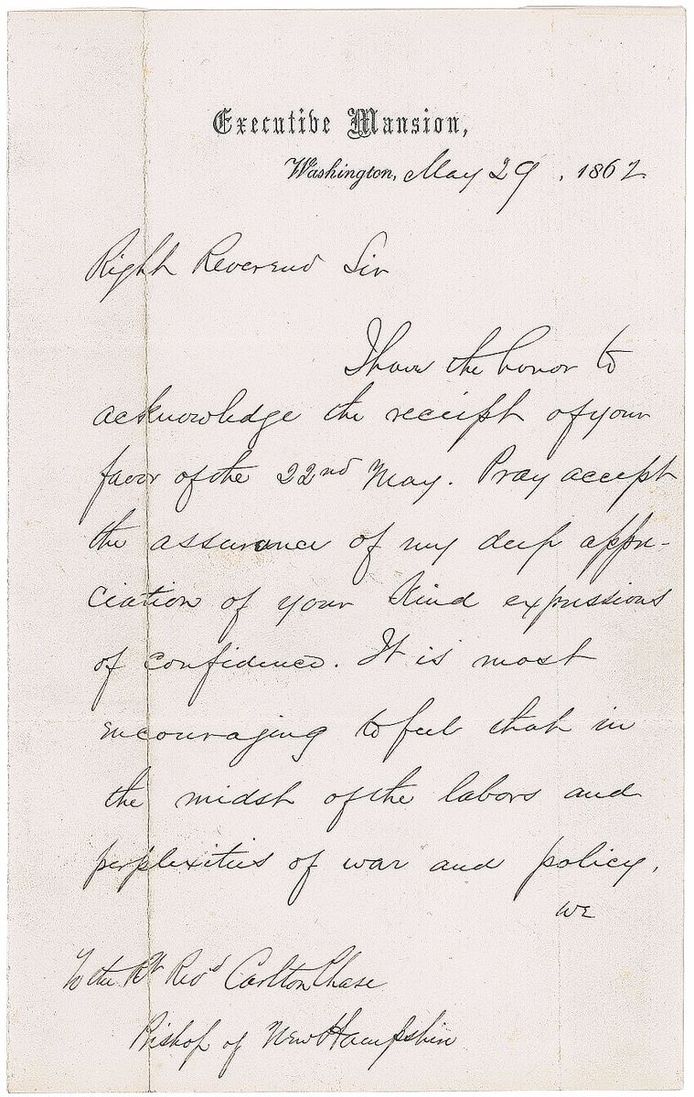 LS as president signed “A. Lincoln,” two pages, 5 x 8, Executive Mansion letterhead, May 29, 1862. Letter to Reverend Carlton Chase, with the body written in the hand of Lincoln’s friend and secretary John G. Nicolay. In full: “I have the honor to acknowledge the receipt of your favor of the 22nd May. Pray accept the assurance of my deep appreciation of your kind expressions of confidence. It is most encouraging to feel that in the midst of the labors and perplexities of war and policy, we are supported by the confidence and sustained by the prayers of good people. It is only less than the approval of God upon our endeavours.” In fine condition, with intersecting folds and archival mounting remnants to top of reverse edges. Accompanied by the original mailing envelope, franked by Nicolay, with the wax Great Seal of the United States; and Chase’s retained copy of his letter to Lincoln. Chase’s initial letter to Lincoln, in part: “I cannot longer restrain the expression of my grateful emotions as I contemplate the manner, in which you, under the divine providence, are shaping the destinies of this afflicted Country.” A remarkable expression of Lincoln’s faith in the guiding hand of divine providence, unpublished in Basler’s Collected Works of Abraham Lincoln.