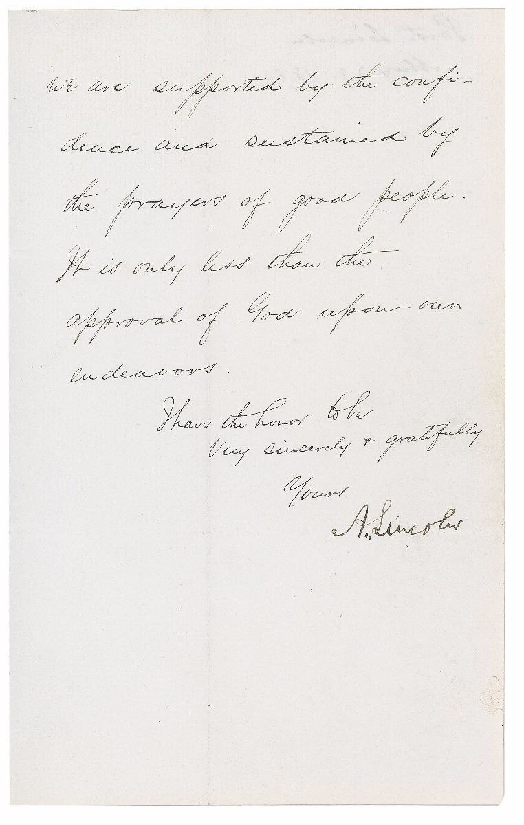 Although he had once been regarded as a skeptic, Lincoln made increasingly frequent public expressions of faith throughout his presidency. His belief in the guiding hand of “divine providence” is most apparent in the Gettysburg Address and his second inaugural address, during which he attributed emancipation and the end of slavery to God’s will. This letter is an especially early example, in keeping with those powerful expressions of Lincoln’s faith, which helped him lead the nation through its greatest strife and turmoil. Letters from President Lincoln invoking God are exceedingly rare—this being one of only two to appear at auction in the last 40 years—and, offering profound insight into the mind of the great man and leader, are of the utmost desirability.