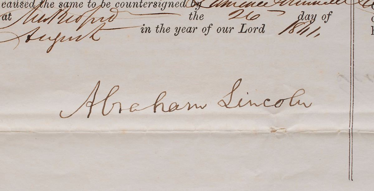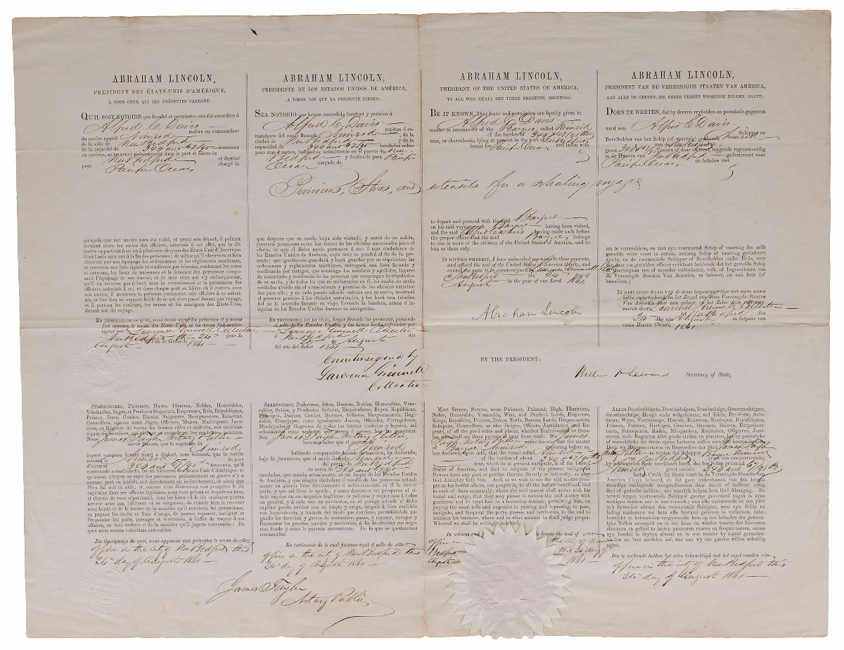 Rare partly-printed DS as president, signed in full, “Abraham Lincoln,” one page, 21.5 x 16.5, August 26, 1861. Four-language ship’s papers issued to “Alfred C. Davis, master or commander of the Barque called Nimrod…lying at present in the port of New Bedford bound for Pacific Ocean, and laden with Provisions, Stores, and utensils for a whaling voyage.” Prominently signed in the third panel by President Lincoln and countersigned below by Secretary of State William H. Seward. The embossed white paper seal affixed at the bottom remains fully intact with especially crisp points. In fine condition, with small tape repairs to edge separations.
