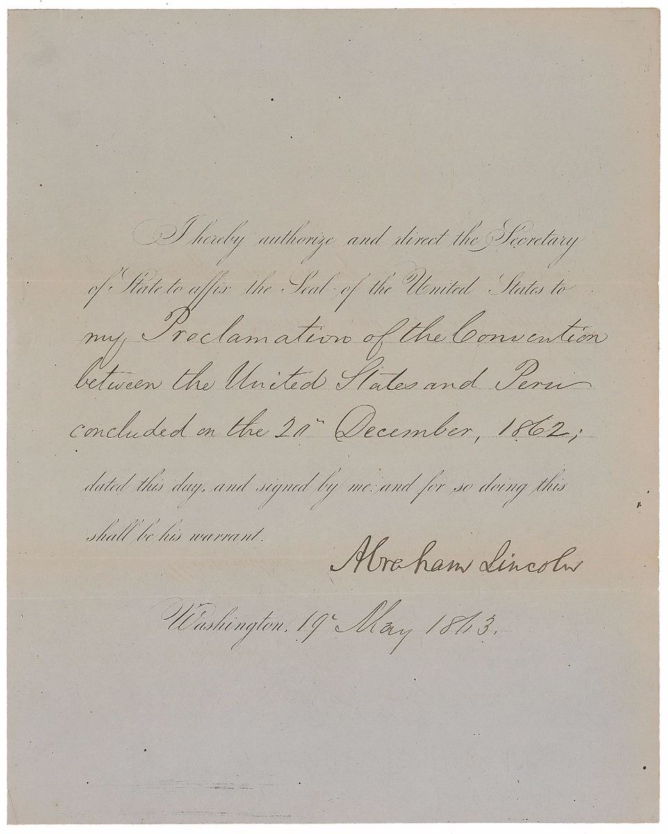 Rare war-dated partly-printed DS as president, one page, 8 x 10, May 19, 1863. President Lincoln approves an international agreement, in part: “I hereby authorize and direct the Secretary of State to affix the Seal of the United States to my Proclamation of the Convention between the United States and Peru concluded on 20 December, 1862.” In fine condition, with subtle toning, and small mounting remnants on integral page.