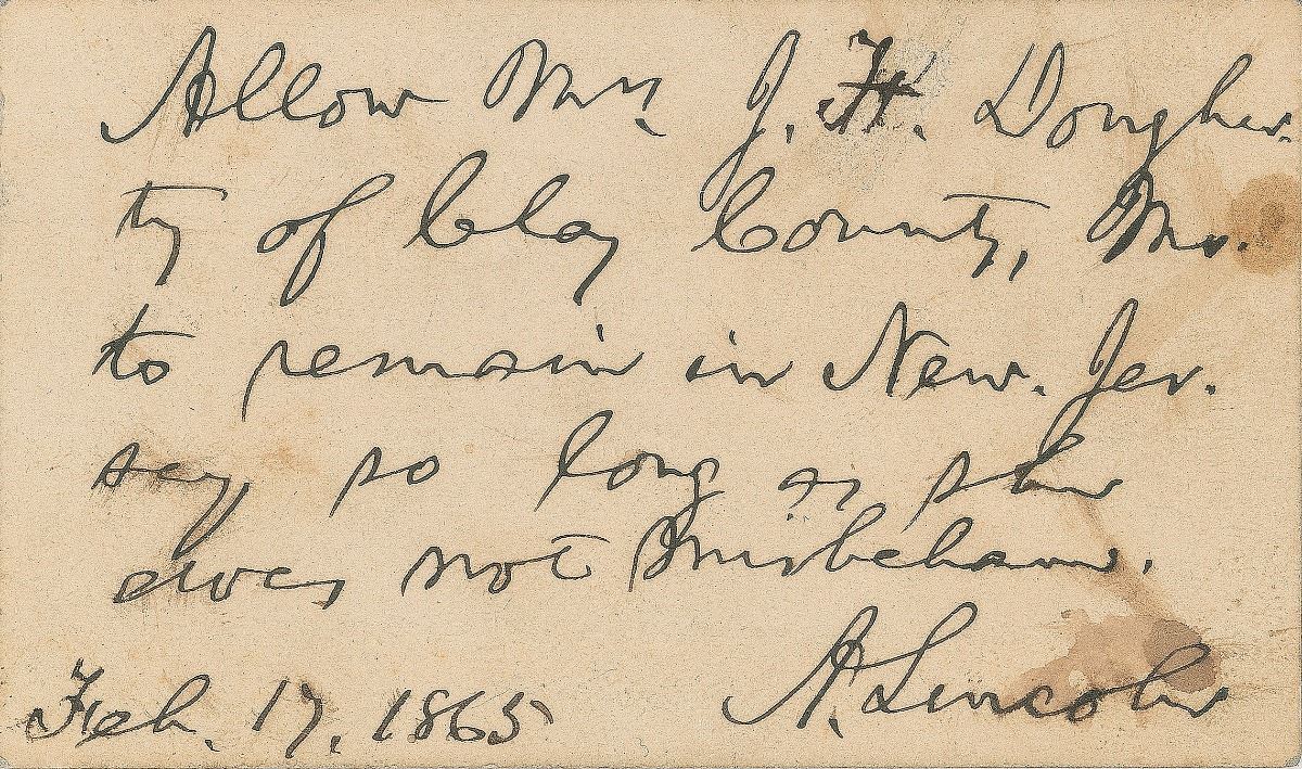 ANS as president signed “A. Lincoln,” one page, 3.25 x 2, February 17, 1865. In full: “Allow Mrs. J. K. Dougherty of Clay County, Mo. to remain in New Jersey so long as she does not misbehave.” In fine condition, with a few small stains. The woman who received this pass was likely the widow of John Kerr Dougherty, nee Irene F. Reed. Her husband had been a sergeant in the Confederacy’s 3rd Missouri Infantry and was part of the charge by General Cockrell's brigade at the Battle of Tennessee, where he was killed near the breastworks. Attending to this matter—a grieving, perhaps enraged widow—was one of many important subjects President Lincoln attended to on February 17th; he also agreed to support the release of Roger A. Pryor, a former congressman from Virginia held as a prisoner of war; considered the case of the spy John Y. Beall, whose death sentence was upheld; and signed the Army commission for his eldest son, Robert Todd Lincoln. Penned amidst a nation’s turmoil and the stresses of the highest office, this is an immensely desirable handwritten presidential note.