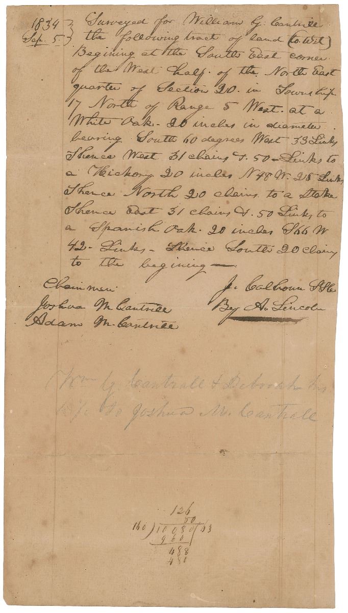 Extremely rare and early ADS, signed “A. Lincoln,” one page, 6.75 x 12, September 5, 1834. A land survey conducted by Lincoln for William G. Cantrall, penned entirely in Lincoln’s own hand, in full: “Surveyed for William G. Cantrill the following tract of land (to Wit) Beginning at the South East corner of the West half of the North East quarter of Section 20 in Township 17 North of Range 5 West at a White Oak, 20 inches in diameter bearing South 60 degrees West 33 Links Thence West 31 chains & 50 Links to a Hickory 20 inches N 48 W. 25 Links Thence North 20 chains to a stake Thence East 31 chains & 50 Links to a Spanish Oak 20 inches S 66 W 42 Links—Thence South 20 chains to the beginning—J. Calhoun SSC By A. Lincoln,” also identifying his assistants, “Chainmen, Joshua M. Cantrill, Adam M. Cantrill.” Intersecting folds (one passing through but not detracting from Lincoln’s signature), light toning, overall wrinkling, and an irregularly trimmed right edge, otherwise fine condition.