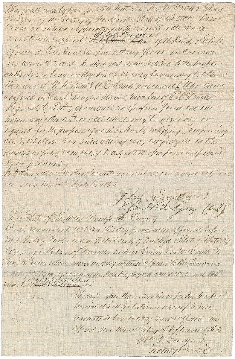 This piece references one of Lincoln’s major steps towards reunifying the nation, his ‘Proclamation of Amnesty and Reconstruction’ of December 8, 1863. By this proclamation, any of those who participated in the rebellion—with the exception of high-ranking Confederate officers—could swear an oath of allegiance to the United States of America and be pardoned with their citizenship, rights, and property restored. For all but the staunchest ideologues, this was an easy decision. Camp Douglas was one of the Union’s largest camps for prisoners of war and had some of the poorest conditions. With President Lincoln’s endorsement, these two prisoners were relieved from the harsh prison life at Camp Douglas and given the freedom to begin anew.