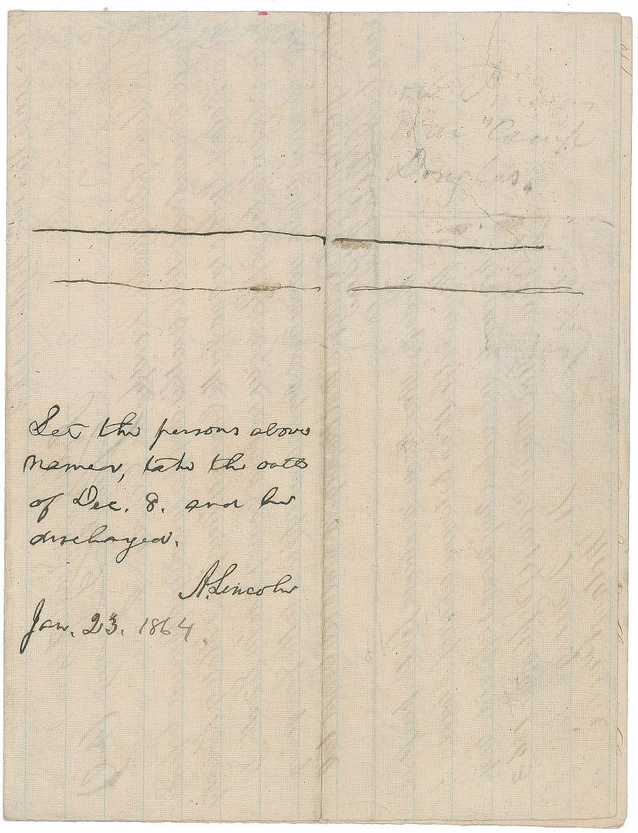 Desirable boldly penned autograph endorsement as president, signed “A. Lincoln,” dated January 23, 1864, penned on the reverse of a petition requesting the release of two prisoners of war, one page, 8 x 12.5, September 14, 1863. Lincoln writes, in full: “Let the persons alone named, take the oath of Dec. 8 and be discharged.” The original document appoints an attorney to execute “any bond or obligation which may be necessary to obtain the release of W. H. Smith & A. C. Smith prisoners of War now confined in Camp Douglas, Illinois, members of Col. Smith’s Regiment CSA.” Professionally cleaned and silked on both sides for reinforcement. In fine condition, with trimmed edges and archival repairs to separated folds.