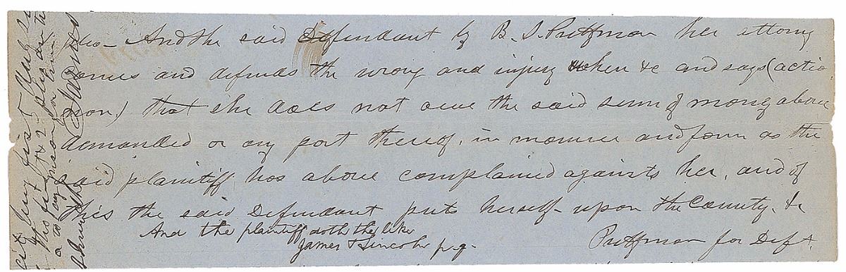 Partial manuscript DS, signed “And the plaintiff doth the like, James & Lincoln, p.q.,” one page, 7.75 x 2.25, no date but circa 1852. Fragment of a legal document penned in another hand, in part: “And the said defendant by B. S. Prettyman, her attorney, comes and defends the wrong and injury when and says (actio non) that she does not owe the said sum of money above demanded.” Lincoln signs along the bottom as the plaintiff’s attorney. In very good to fine condition, with a central horizontal fold and scattered overall light creasing. During this period Lincoln had solidified his reputation as a talented lawyer after representing the Alton & Sangamon Railroad against one of its shareholders in 1851. It was Lincoln’s unwavering integrity in his legal practice that gave rise to his famous nickname, ‘Honest Abe.’