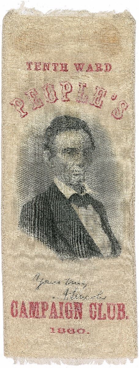 Campaign ribbon with red text reading, “Tenth Ward People’s Campaign Club, 1860,” 3 x 8.25, featuring a portrait and facsimile signature of Lincoln in the center. In very good to fine condition, with show-through from old mounting remnants on reverse.