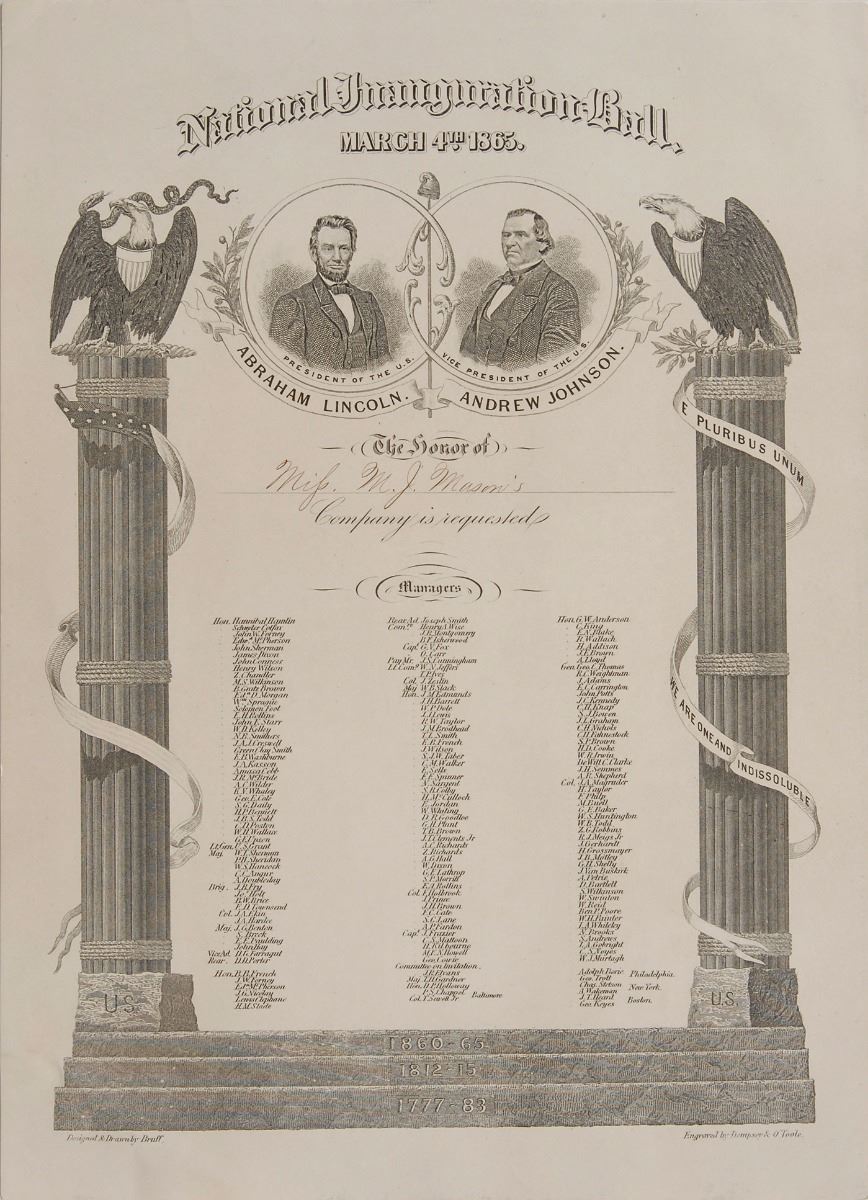 Handsome engraved invitation to the “National Inaugural Ball, March 4th, 1865,” engraved by Dempsey & O’Toole, 7.5 x 10.5, featuring images of Abraham Lincoln and Andrew Johnson, a Liberty cap, two American eagles atop columns, and a list of “managers.” The partly-printed invitation is inscribed to read, “The honor of Miss. M. J. Mason’s Company is requested.” In fine condition, with a small bend to the lower left corner. A sought-after inaugural piece of the utmost visual appeal.
