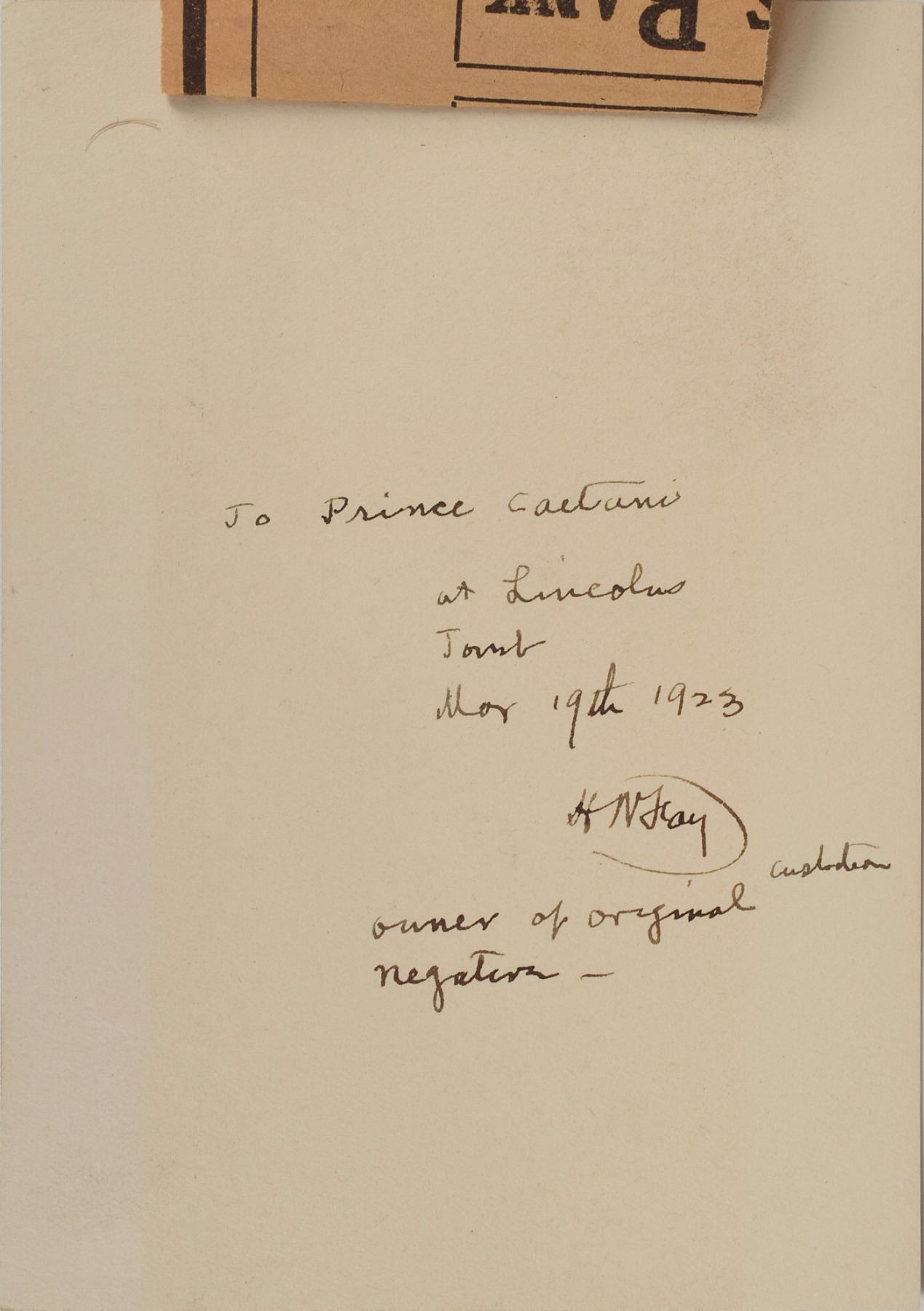 Section of wood recovered from Abraham Lincoln's home in Springfield, Illinois, 1 x 3.25, affixed to the first page of a pamphlet entitled "Abraham Lincoln and His Last Resting Place," published by the Royal Printing Company of Quincy, Illinois. The page also bears a fountain pen signature and inscription in the hand of Herbert Wells Fay, the longtime custodian of the Lincoln Tomb: "To Prince Gelasio Caetoni, at Lincoln's Tomb, March 9th 1923, accompanying a piece of wood from Lincoln's Springfield home, H. W. Fay, custodian—." Also includes a matte-finish 3.5 x 5 portrait of Lincoln attributed to Christopher S. German, the photographer to the president-elect, which is signed and inscribed on the reverse in fountain pen, "To Prince Caetoni, at Lincoln's Tomb, Mar 19th 1923, H. W. Fay, custodian, owner of original negative—." In fine condition. Fay worked as an editor for the DeKalb Review before serving as custodian of the Lincoln Tomb in Springfield, Illinois in 1921. An avid collector of Lincolniana, Fay owned 90 different portraits of Abraham Lincoln as part of his enormous collection—all of which he housed in a utility room within the Springfield Tomb.