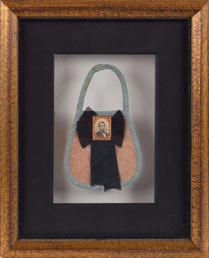 Small mourning badge featuring a .75 x 1 photographic portrait of Abraham Lincoln, applied to a black crepe bow and affixed to a larger 3 x 5 coin pouch. Matted and framed to an overall size of 8.5 x 10.5. In fine condition.