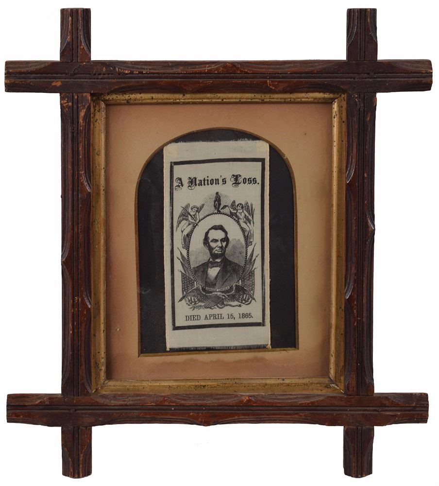 Original circa 1865 silk mourning ribbon memorializing Abraham Lincoln, 2.75 x 5.75, with text at the top reading, "A Nation's Loss," and at the bottom, "Died April 15, 1865." The design features a central portrait of the fallen president, with angels above and a spread-winged patriotic eagle below. Rustically mounted, matted, and framed to an overall size of 13 x 11.5. In fine condition.