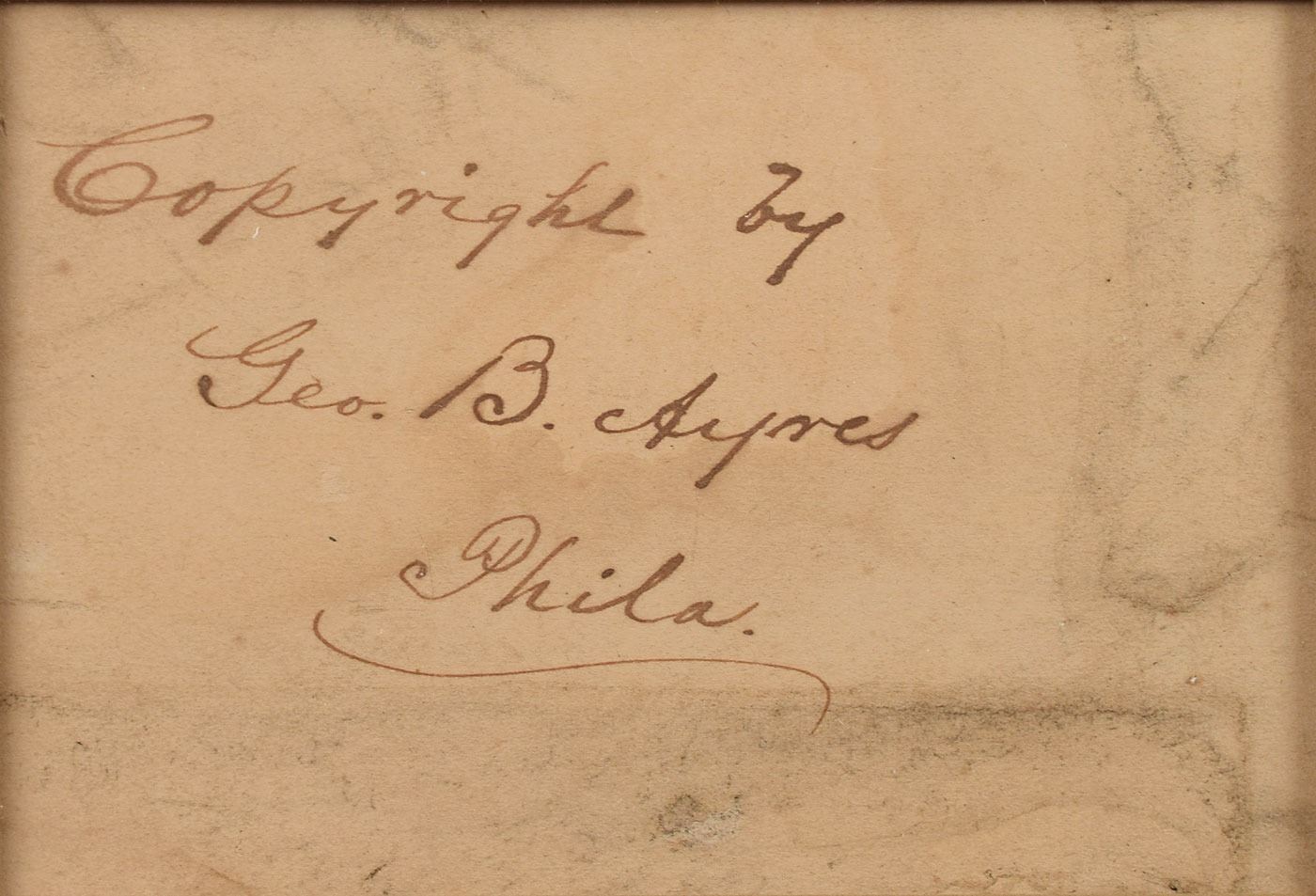 Sought-after photograph of Lincoln in near-profile, 7 x 9, printed in the late 19th century by George B. Ayres from the original negative taken by Alexander Hesler in Springfield, Illinois, in 1860. Affixed to its original 8 x 10 mount, annotated on the reverse in ink by Ayres, “Copyright by Geo. B. Ayres, Phila.” Matted together with numerous strands of Lincoln's hair cut by the surgeon on the night of his assassination, and framed to an overall size of 11.5 x 15; a window in the backing reveals Ayres's annotations. In very good condition, with irregular blocks of toning to image and staining to reverse. Accompanied by a flash drive containing extensive documentation regarding the hair, which was sold in 1914 in the sale of Major William H. Lambert's collection of Lincolniana at Anderson Galleries. Also on the drive are images of letters dating back to 1905, including those of Charles C. Taft, whose father, Dr. Charles S. Taft, attended to President Lincoln on his deathbed. The original full lock of hair had remained in the Taft family until it was sold to Lambert.