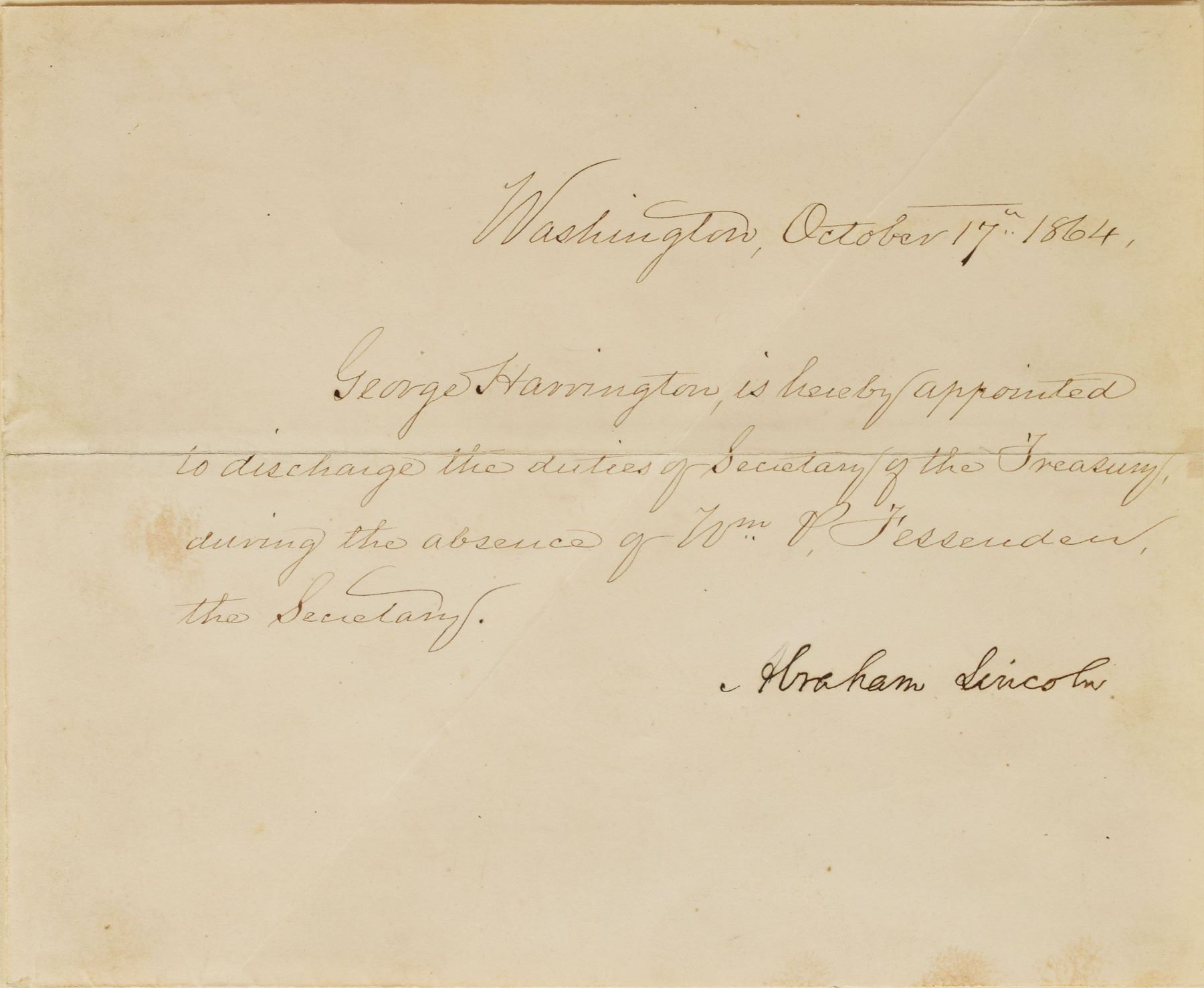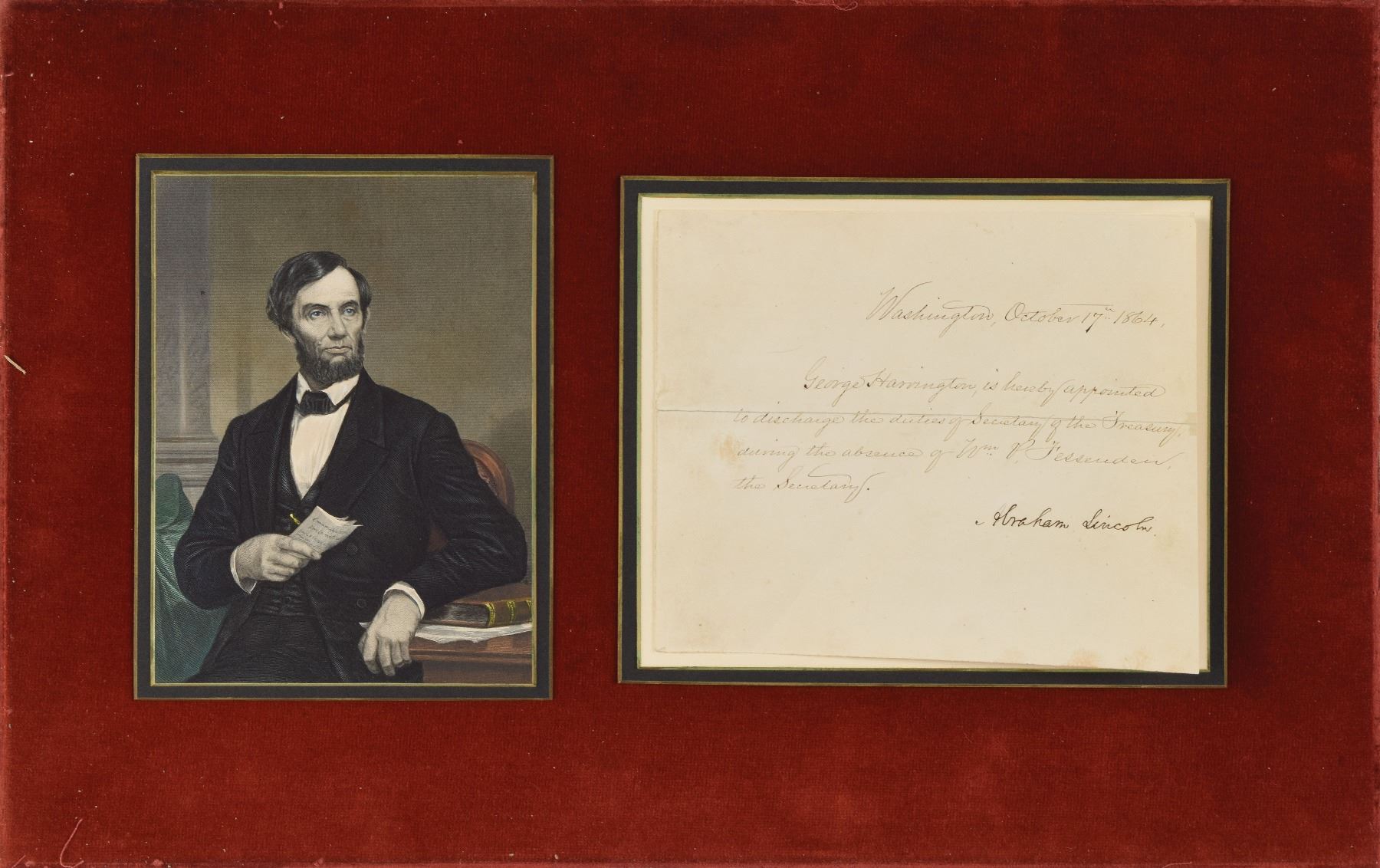 Civil War-dated manuscript DS as president, one page, 7.75 x 6.5, October 17, 1864. In full: "George Harrington, is hereby appointed to discharge the duties of Secretary of the Treasury, during the absence of Wm. P. Fessenden, the Secretary." Signed boldly at the conclusion by President Lincoln. Mounted and matted with a portrait of Lincoln to an overall size of 20 x 12.75, with reverse of mat bearing an affixed certificate of authenticity from Charles Hamilton. In very good to fine condition, with light soiling, a diagonal crease, and archival repair on the reverse to separation along the central horizontal fold. A native of Roxbury, Massachusetts, Harrington enjoyed a successful career within the Treasury Department and was appointed by Lincoln to acting Secretary of the Treasury no less than an astounding twenty times, assuming the position whenever Fessenden, Salmon Chase, or Hugh McCulloch were unable. Just six months after the date of this appointment, Harrington had the somber and imposing task of planning the Lincoln funeral in Washington, and was himself named Grand Marshal for the procession.