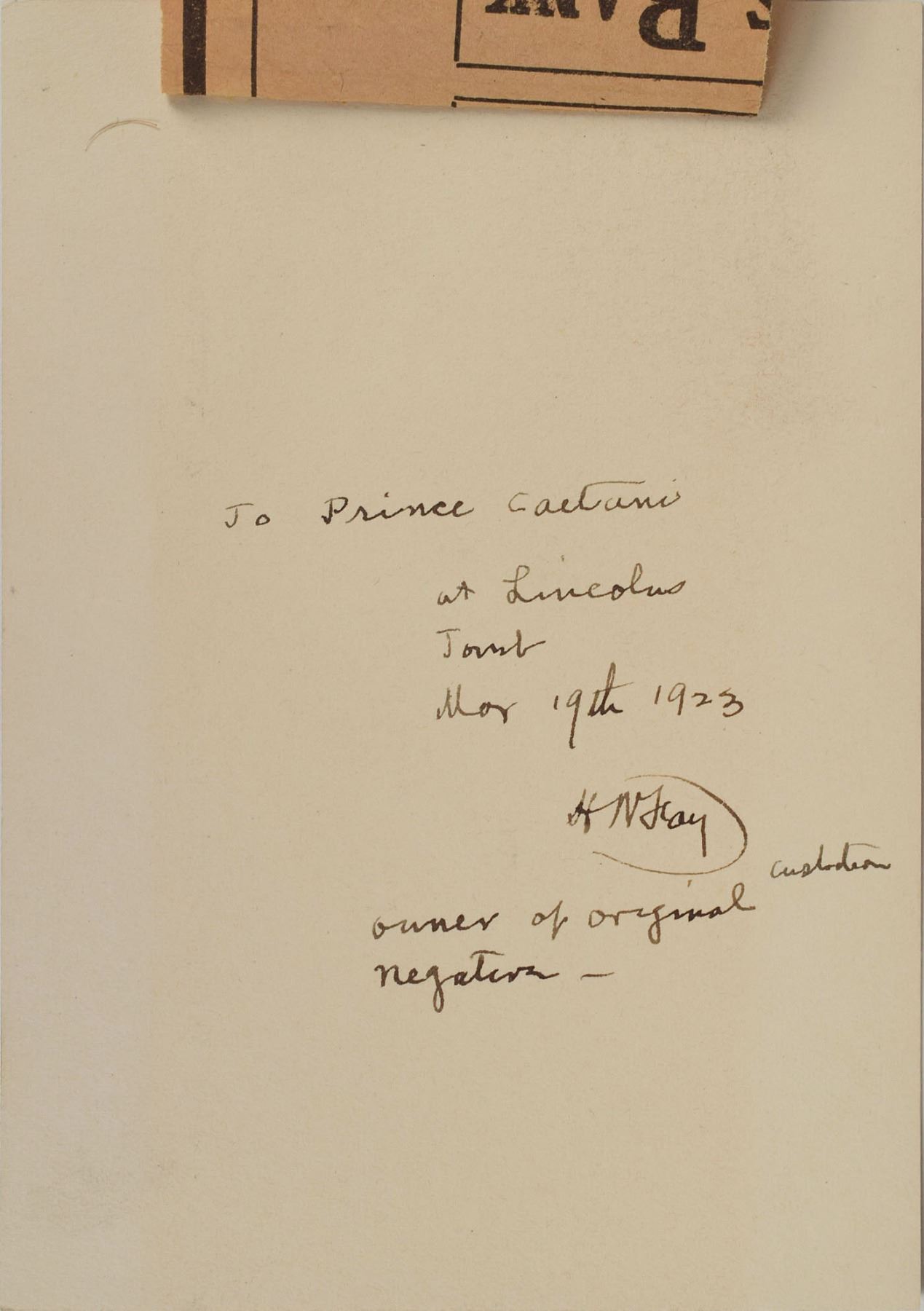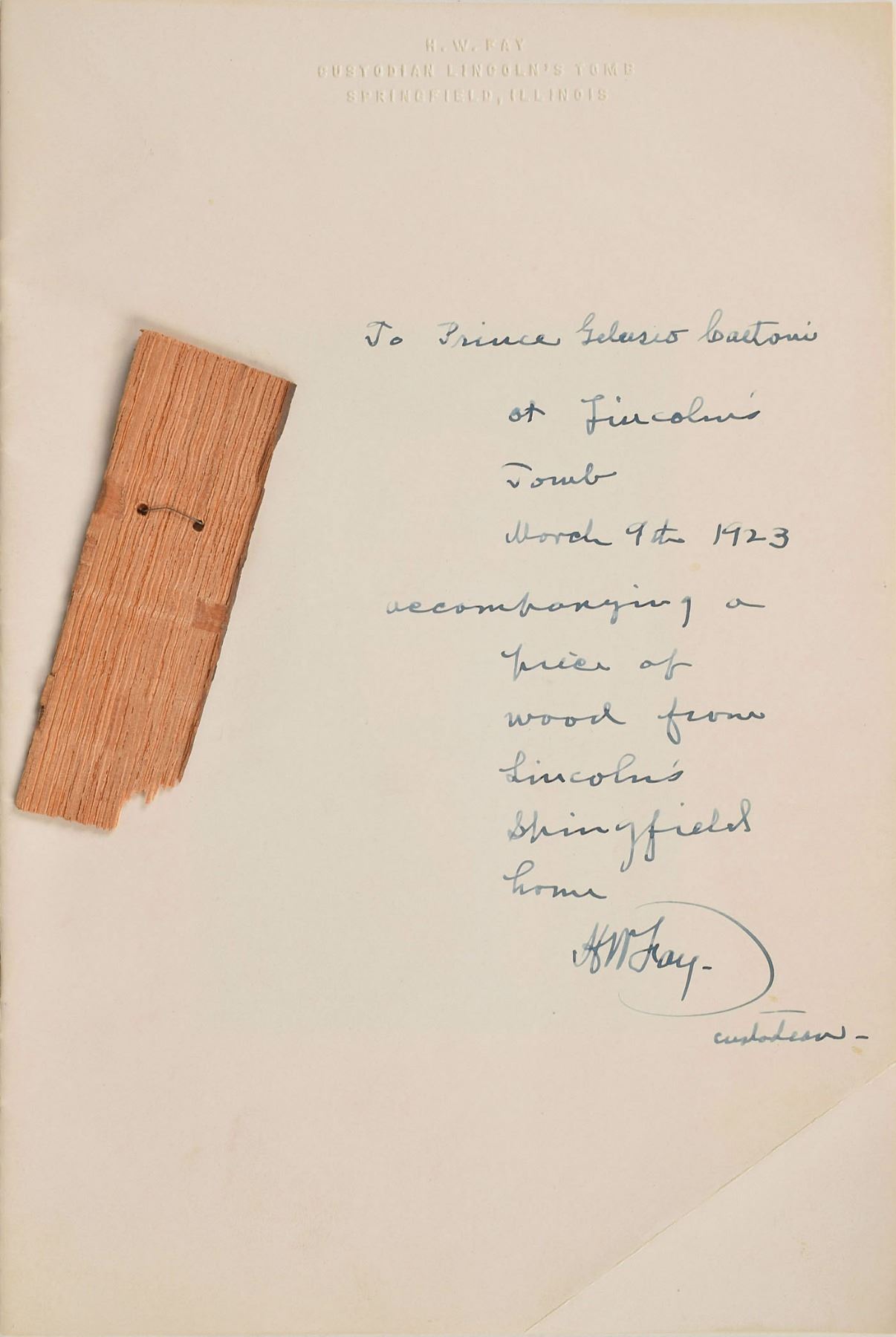 Section of wood recovered from Abraham Lincoln's home in Springfield, Illinois, 1 x 3.25, affixed to the first page of a pamphlet entitled "Abraham Lincoln and His Last Resting Place," published by the Royal Printing Company of Quincy, Illinois. The page also bears a fountain pen signature and inscription in the hand of Herbert Wells Fay, the longtime custodian of the Lincoln Tomb: "To Prince Gelasio Caetoni, at Lincoln's Tomb, March 9th 1923, accompanying a piece of wood from Lincoln's Springfield home, H. W. Fay, custodian—." Also includes a matte-finish 3.5 x 5 portrait of Lincoln attributed to Christopher S. German, the photographer to the president-elect, which is signed and inscribed on the reverse in fountain pen, "To Prince Caetoni, at Lincoln's Tomb, Mar 19th 1923, H. W. Fay, custodian, owner of original negative—." In fine condition, with a crease to the lower right corner of the presentation page. Fay worked as an editor for the DeKalb Review before serving as custodian of the Lincoln Tomb in Springfield, Illinois in 1921. An avid collector of Lincolniana, Fay owned 90 different portraits of Abraham Lincoln as part of his enormous collection—all of which he housed in a utility room within the Springfield Tomb.