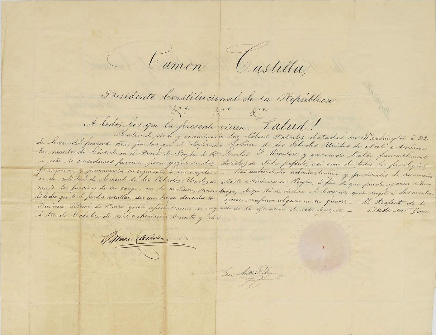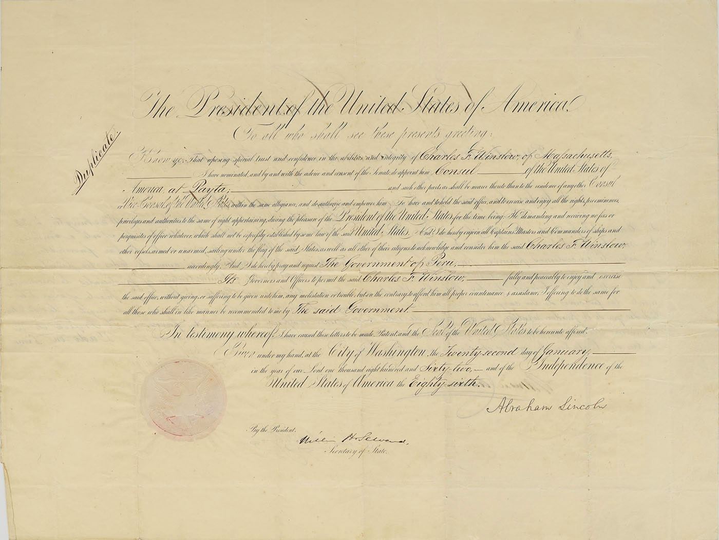 Extraordinary partly-printed DS as president, signed “A. Lincoln,” one page, 20 x 15.75, January 22, 1862. Unusual document marked "Duplicate," being an appointment for Charles F. Winslow of Massachusetts to be "Consul of the United States of America at Payta." Crisply signed at the conclusion in ink by President Lincoln and countersigned by Secretary of State William H. Seward. The reverse bears a lengthy endorsement in Spanish, signed at the conclusion by Ramon Castilla, the president of Peru. In very good to fine condition, with overall light creasing, and tiny areas of paper loss at some of the the intersections of its multiple folds. By this document, President Lincoln named Charles F. Winslow, a Harvard Medical School–educated physician, diplomat, and world traveler, as the US Consul at Payta, Peru, a noted whaling port. This piece boasts an especially remarkable association: just as Lincoln was responsible for ending slavery in the United States, Castilla abolished slavery in Peru. A decidedly intriguing diplomatic appointment from the Lincoln administration, boasting an international pairing of bold, crisp presidential signatures.