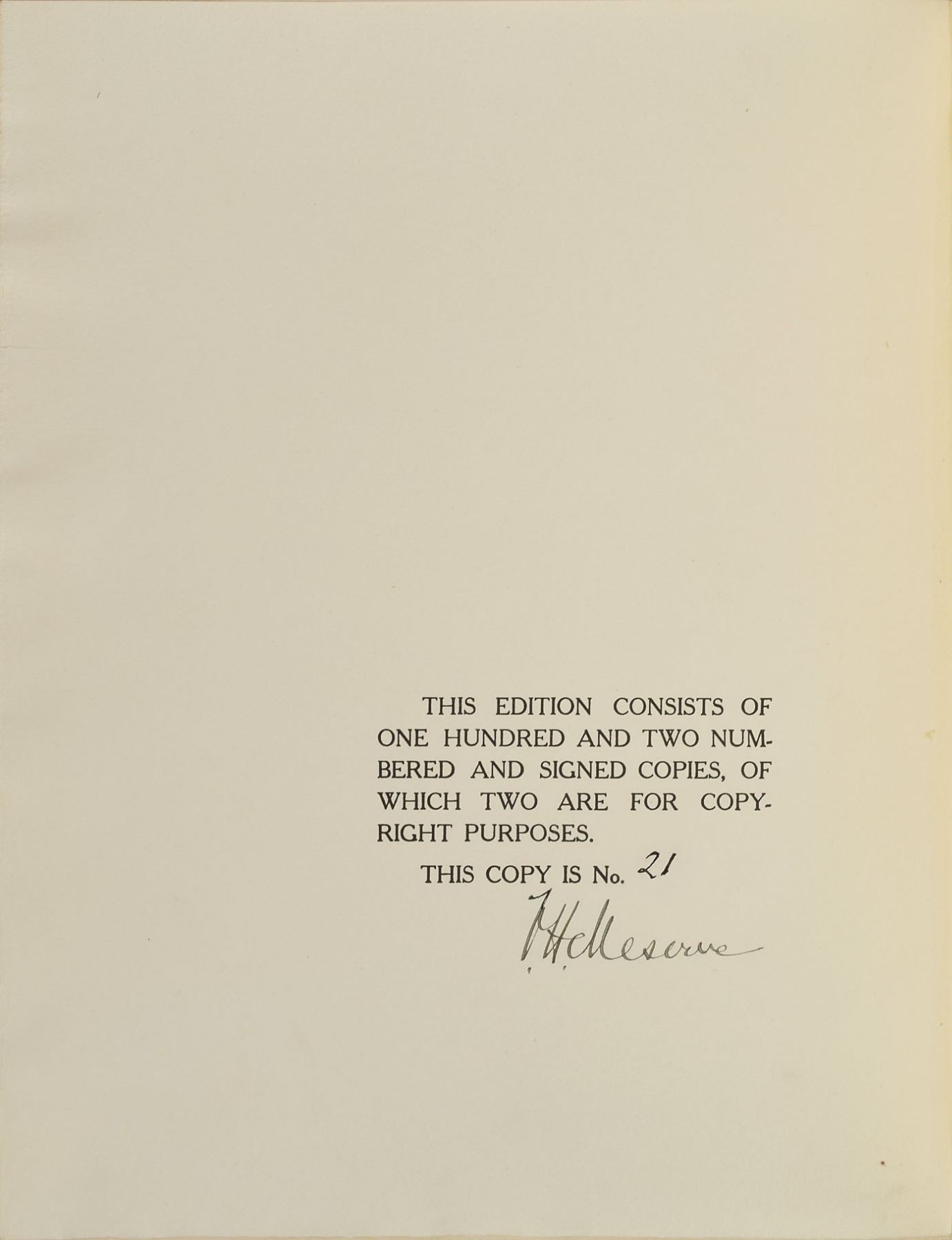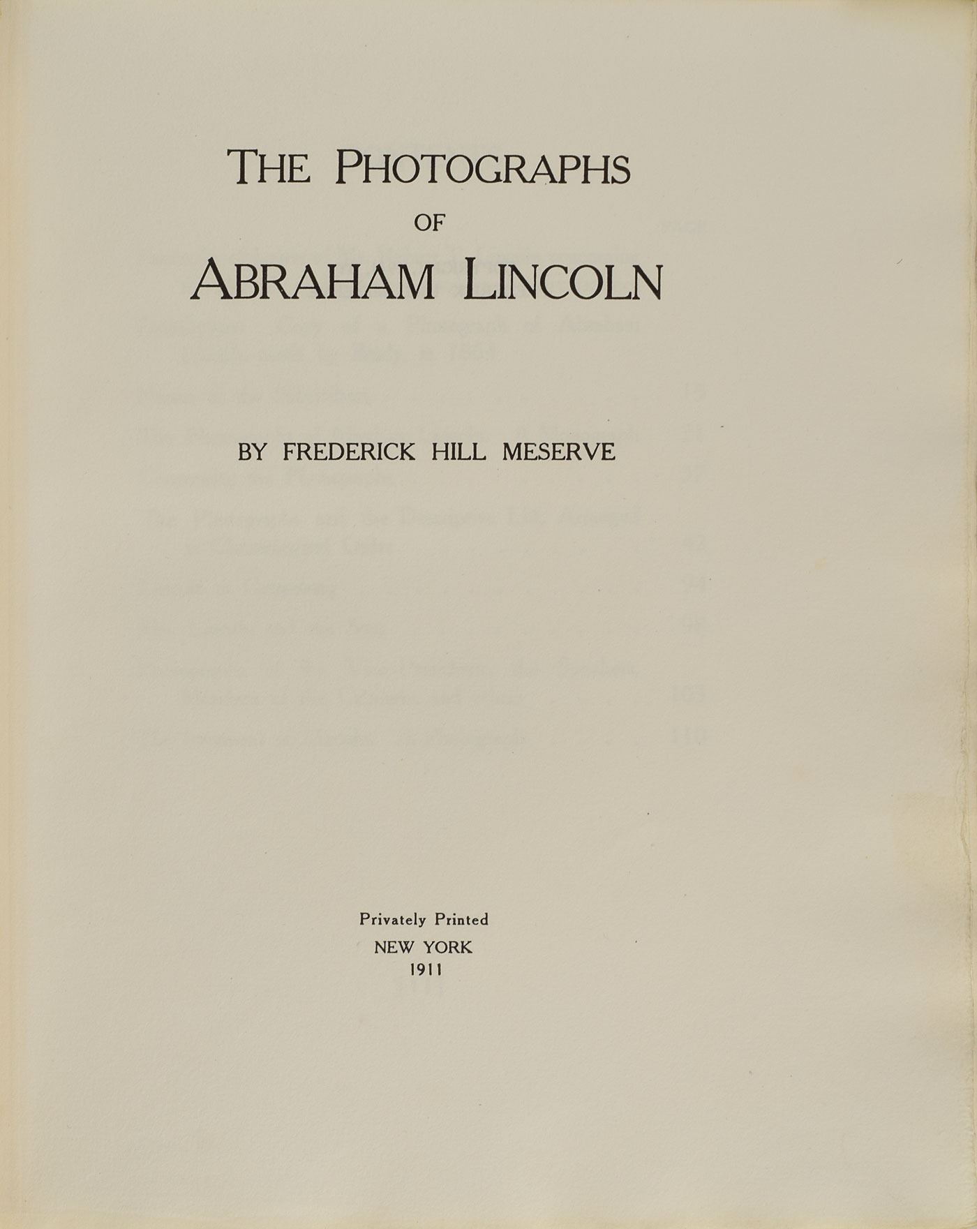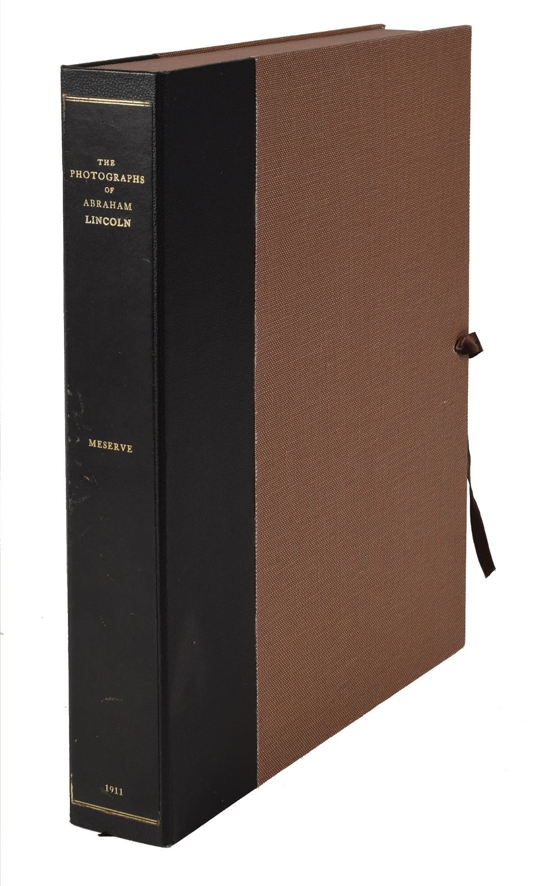 Rare book: The Photographs of Abraham Lincoln by Frederick Hill Meserve. Limited edition, numbered 21/102. NY: Privately-printed, 1911. Hardcover, 9.25 x 11, 111 pages. Signed on the colophon by the author, "F. H. Meserve." The book reproduces the then-known photographs of Abraham Lincoln, consisting of 74 pages of text plus tipped-in silver print photographs struck from the original negatives in the Meserve Collection. The photographs are arranged by topic: The Photographs of Abraham Lincoln (100), Lincoln at Gettysburg (3), Mrs. Lincoln and the Sons (4), Photographs of the Vice-Presidents, the Speakers, Members of the Cabinet and Others (12), and The Interment of Lincoln (1). In fine condition, with wear to spine and board edges; all tissue guards are present and without stains or foxing, and the deckle-edge pages are likewise bright and crisp. Accompanied by a deluxe custom-made clamshell case. An exquisite compendium of photographs of Lincoln that is rarely available today.