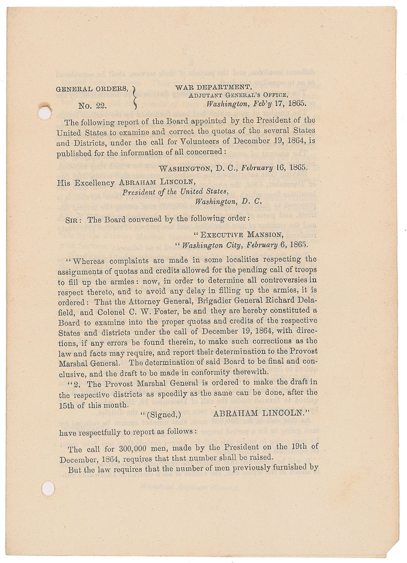 Original printed proclamation, 5 x 7.25, three pages on two adjoining sheets, dated February 17, 1865. A proclamation made by President Abraham Lincoln, titled “General Orders No. 22,” concerning the examination and correction of the quotas of the several States and Districts under the call for Volunteers of December 19, 1864. On February 6, 1865, Abraham Lincoln issued an order to address complaints “respecting the assignments of quotas and credits allowed for the pending call of troops to fill up the armies.” He appointed Attorney General James Speed, Brigadier General Richard Delafield, and Colonel C. W. Foster to examine the issue. On February 16, the Board reported that they found the rule by which the Provost Marshal General assigned quotas to be “in conformity with the requirements of the laws of Congress, and is just and equitable. We have carefully examined and proved the work done under this rule by the Provost Marshal General, and find that it has been done with fairness.” President Lincoln approved the report on February 17, 1865. The Provost Marshal General was responsible for apportioning Lincoln’s December 1864 call for 300,000 men among the Congressional districts, taking into account the number of men previously furnished by each district and their periods of service. In fine condition, with two file holes to left side.