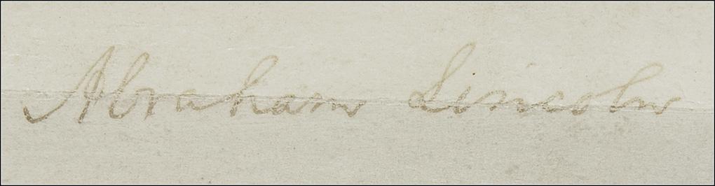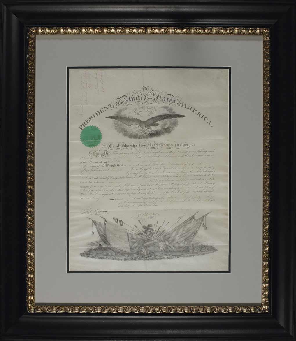 DS as president, one page, 15.75 x 19.5, July 1, 1864. Lincoln appoints Edward J. Whitney “Surgeon of Volunteers in the service of the United States.” Signed at the conclusion in ink, “Abraham Lincoln,” and countersigned by Secretary of War Edwin Stanton. Double matted and framed to an overall size of 27 x 31. Intersecting storage folds, one passing horizontally through Lincoln’s signature, Lincoln’s signature and handwritten portions of document a few shades light, but completely legible, and light edge toning, otherwise fine condition. The striking green wafer seal is soiled and cracked, but intact.