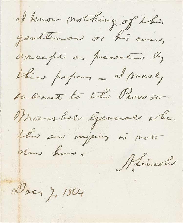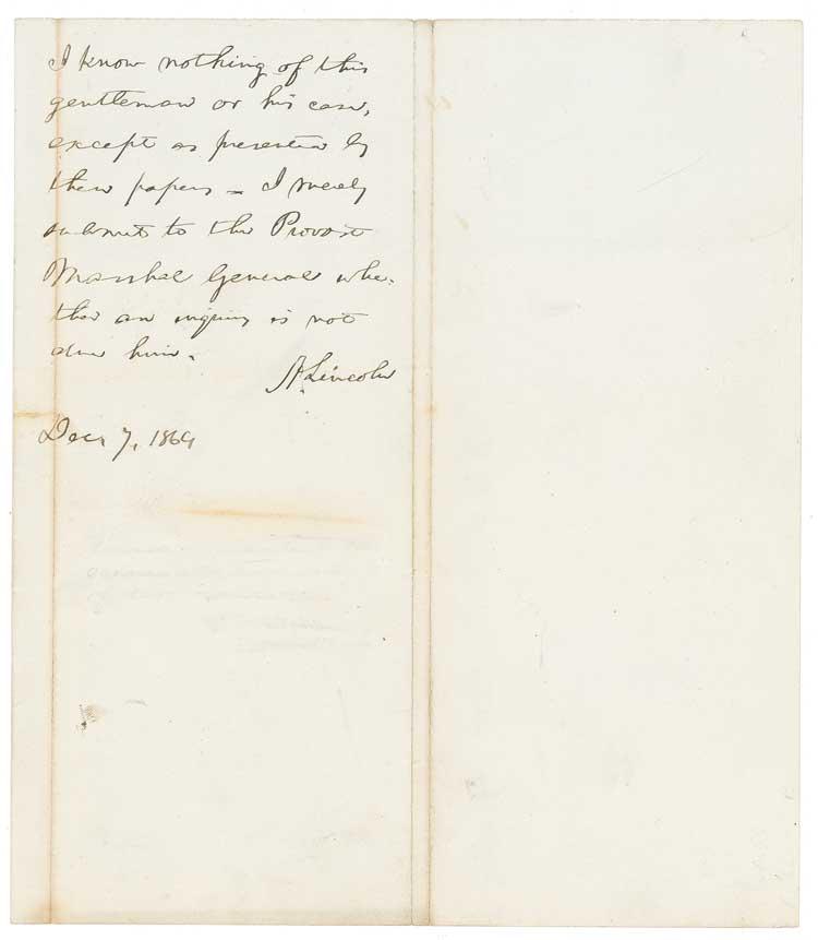 Lincoln’s endorsement reads in full, “I know nothing of this gentleman or his case, except as presented by these papers – I merely submit to the Provost Marshal General [James B. Fry] whether an inquiry is not due him. A. Lincoln, Dec 7, 1864.” Professionally cleaned and in fine condition, with a lightly toned vertical fold passing through first letter of each line of endorsement, and Foster’s writing a couple of shades light, but still completely legible.