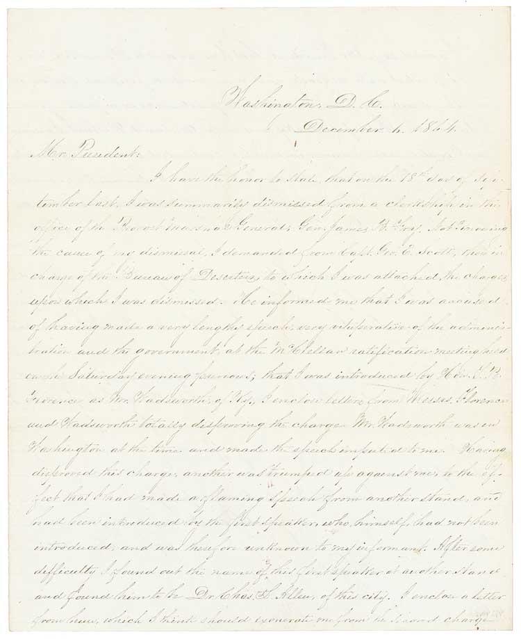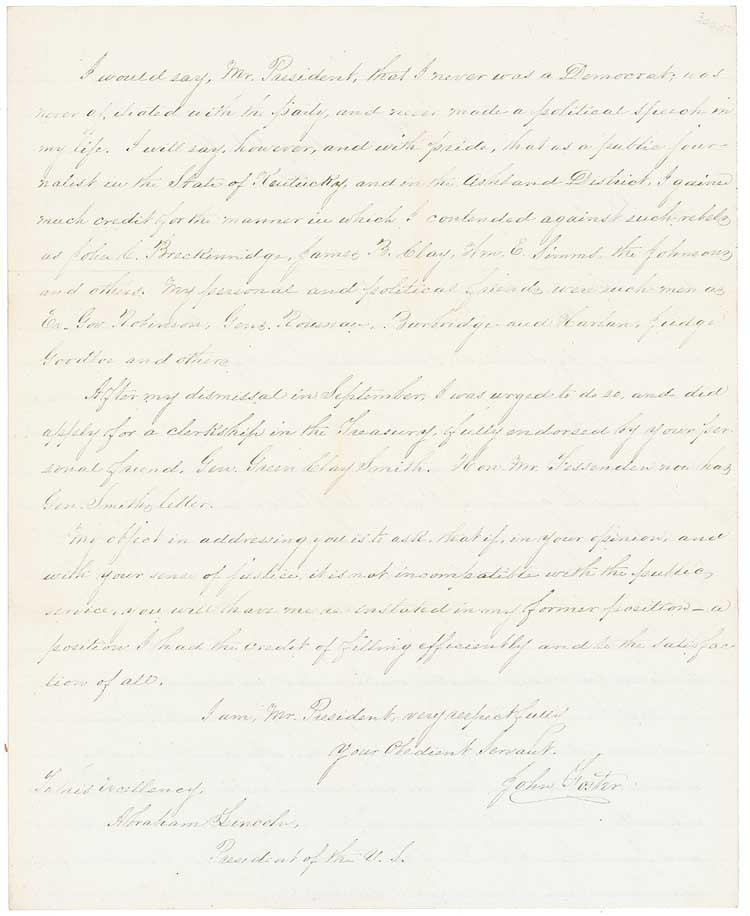 War-dated handwritten endorsement, as president, “A. Lincoln,” dated December 7, 1864, on an off-white 7 x 8 sheet, originally the integral second page of a letter to Lincoln from John Foster. Foster’s (included) lengthy letter, dated December 6, 1864, on both sides of a lightly-lined 8 x 10 page, expresses his concern that he was dismissed from his position as a clerk because of a “very lengthy speech, very vituperative of the administration and the government at the McClellan ratification meeting...My object in addressing you is to ask that if in your opinion, and with your sense of Justice, it is not incompatible with the public service you will have me instated in my former position – a position I had the credit of fitting efficiently and to the satisfaction of all.”