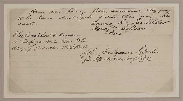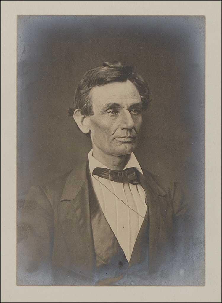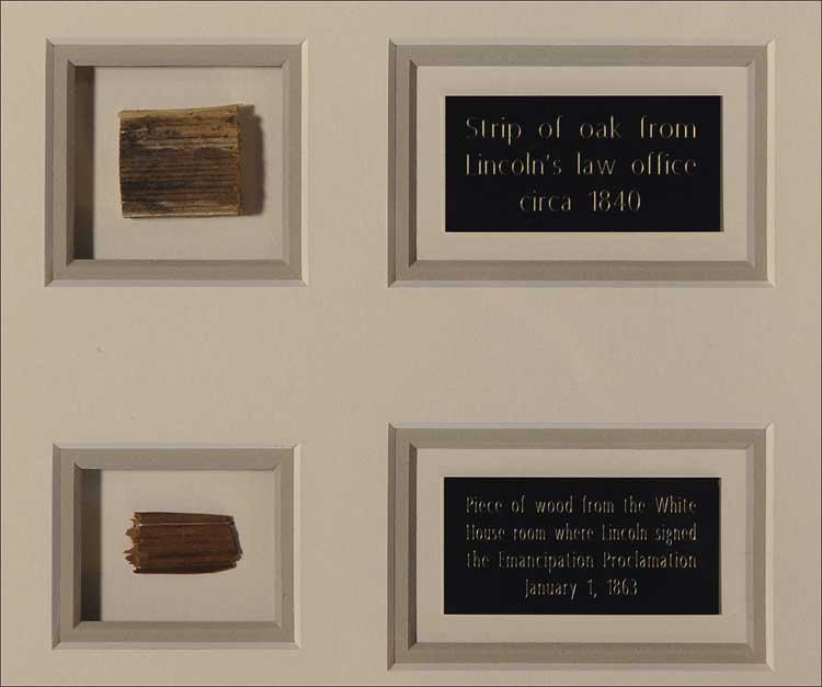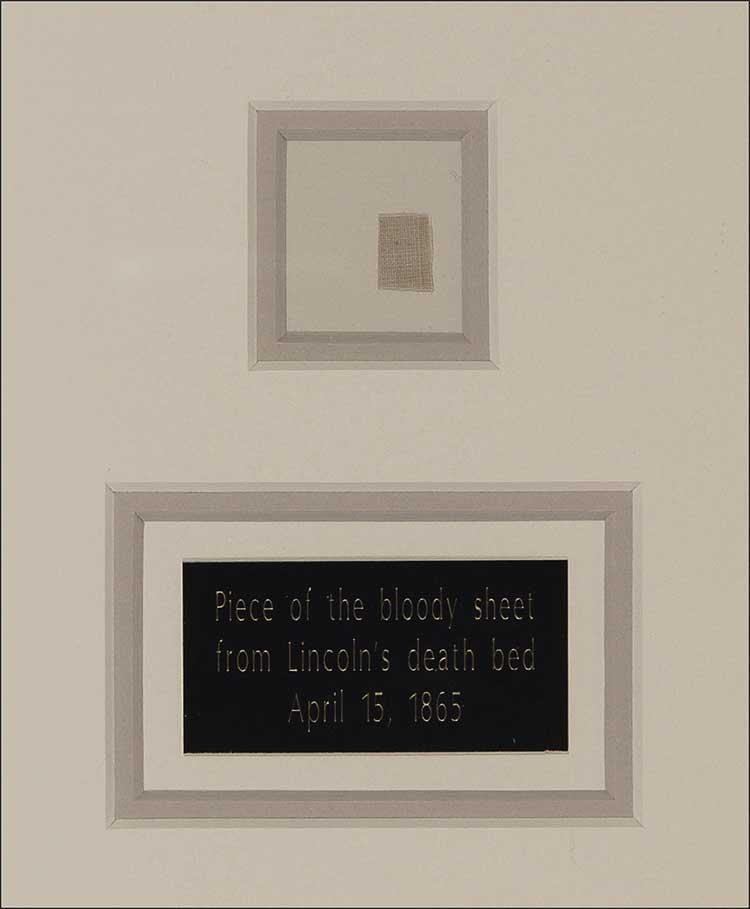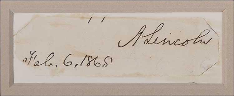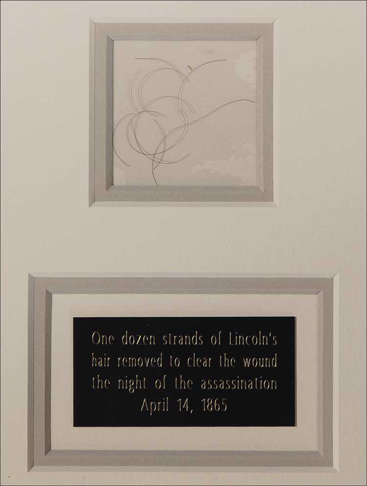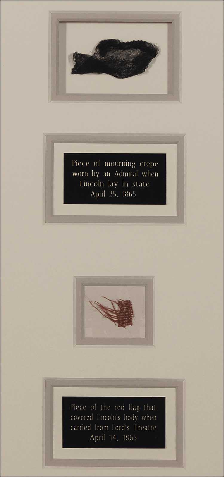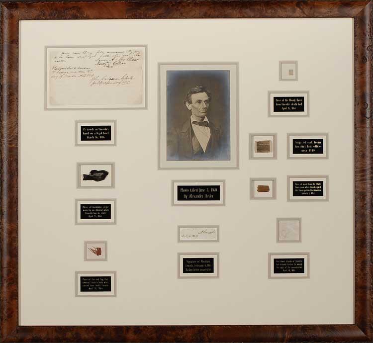 Remarkable Lincoln reliquary spanning his life, from his early legal career to his assassination consisting of: an ink signature, as president, “A. Lincoln, Feb. 6, 1865,” on an off-white slip clipped from a larger document; a handwritten unsigned legal endorsement on a 7.5 x 4.5 legal brief, dated March 16, 1846, in another hand. Lincoln writes: “And now having fully answered, they pray to be hence discharged with their reasonable costs.” Also included is a vintage unsigned portrait of Lincoln, 6.25 x 8.5, as candidate for President, taken June 3, 1860, by Alexander Hesler in Springfield, Missouri. Printed by George B. Ayres from the original negative. Ayres purchased Hesler’s original plates just after the Civil War. In 1881, Hesler printed photographs from these plates in a number of different sizes. This is a fairly early print. In 1933 the plates were damaged beyond repair when sent through the mail to Washington. Other items included are: a small section of the blood-stained sheet upon which Lincoln lay in his final hours; a small portion of oak lathing, removed from the building in which the Lincoln and Herndon Law Offices were located; a small section of wood from the White House room where President Lincoln signed the Emancipation Proclamation on January 1, 1863; twelve strands of Lincoln’s hair removed to clear the wound the night of the assassination; a less than one inch square red piece of the flag that covered President Lincoln on the night of April 14, 1865, as he was carried across 10th Street from Ford’s Theatre to the Peterson House where he died the next morning; and a black mourning crepe, 1.5 x 1, worn by U. S. Navy Paymaster Charles H. Eldridge when Lincoln lay in state in City Hall, New York City, on April 25, 1865. Eldridge, later Rear Admiral, was on detail as Guard of Honor from 2 AM to 4 AM. All items are beautifully double matted and framed with engraved descriptive plaques, to an overall size of 30.75 x 28.5. Clipped corners to signature, folds to brief, and light silvering to image, otherwise fine condition. Oversized. Pre-certified John Reznikoff/PSA/DNA and RRAuction COA.