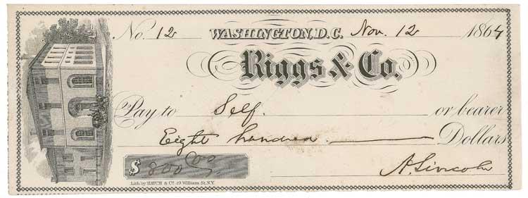 Rare war-dated bank check, 7.5 x 2.75, filled out and signed by Lincoln, as president, “A. Lincoln,” drawn on his Riggs & Co. account, Wahington, payable to Self for $800, November 12, 1864. In fine condition, with expected unobtrusive cancellation cut to center, a few light ink brushes, a touch of trivial toning, and two barely noticeable staple holes.