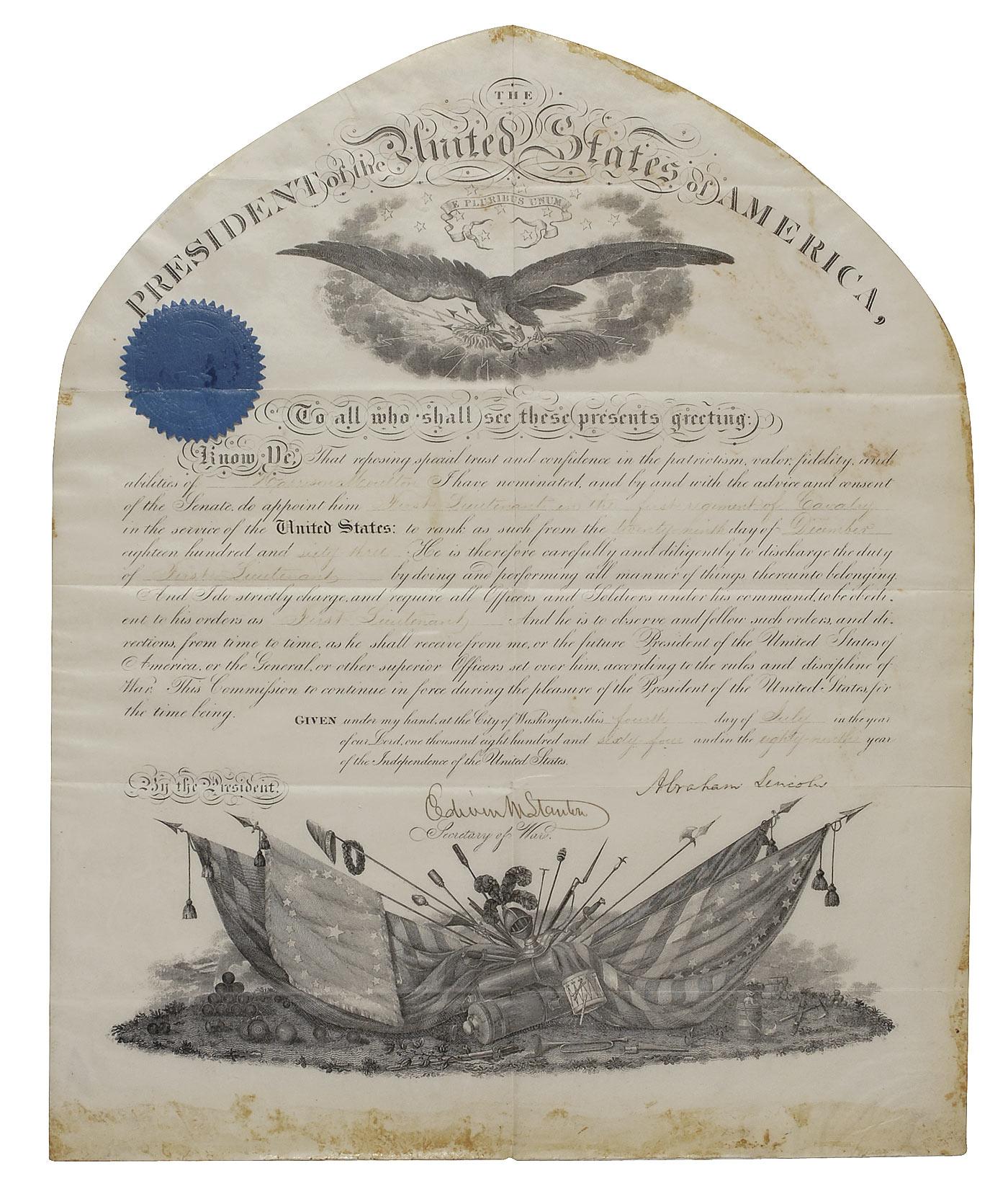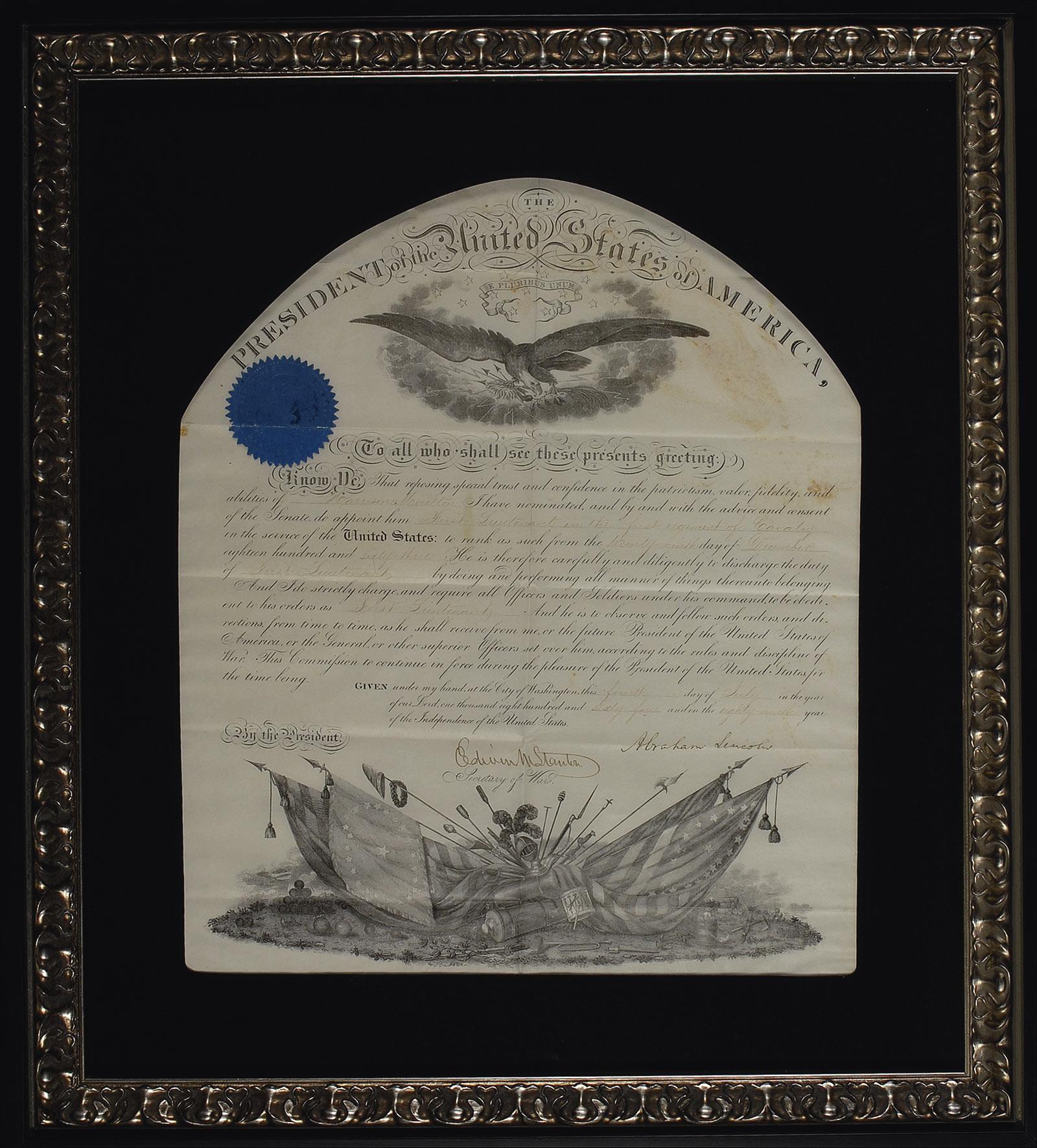 Partly-printed war-dated DS as president, one page, 13.5 x 16, July 4, 1864. President Lincoln appoints Harrison Moulton a “First Lieutenant in the first regiment of Cavalry.” Signed at the conclusion in black ink, “Abraham Lincoln,” and countersigned by Secretary of War Edwin Stanton. Cloth matted and framed to an overall size of 21 x 23.5. In very good to fine condition, with trimmed and rounded top edge, previous storage folds, with one horizontal fold bisecting Lincoln’s signature, handwritten portions of text light, but legible, some scattered toning primarily to upper right, and blue seal intact and slightly worn. Oversized. Pre-certified John Reznikoff/PSA/DNA and RRAuction COA.