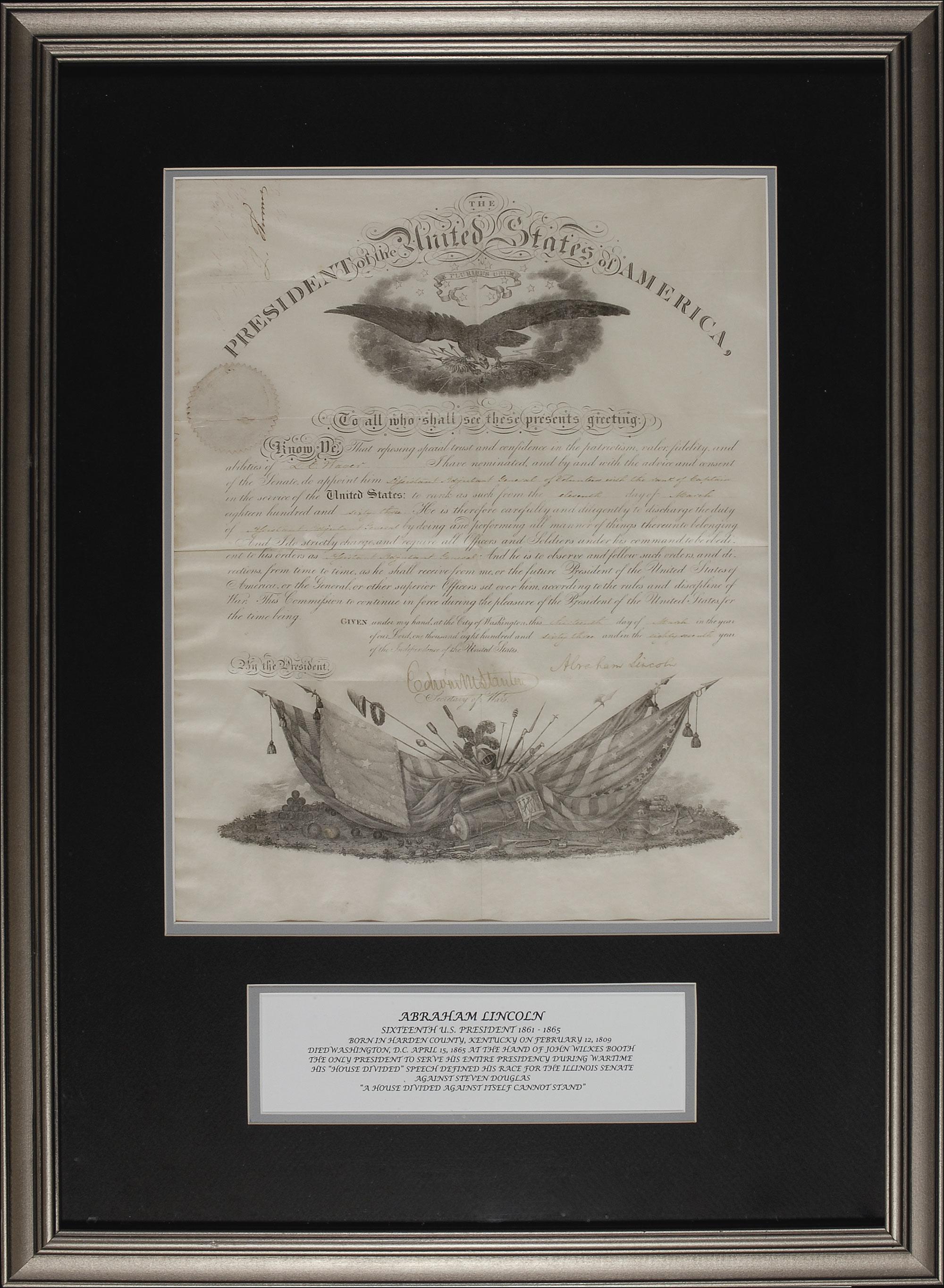 War-dated partly-printed vellum DS as president, one page, 14 x 17.5, March 13, 1863. Lincoln promotes D. D. Wager to the rank of “Assistant Adjutant General of Volunteers with the rank of Captain.” Signed at the conclusion by Lincoln, and countersigned by Secretary of War Edwin Stanton. Double matted and framed with a biographical caption, to an overall size of 22.5 x 30.5 In very good condition, with intersecting folds, mild overall toning, expected moderate wrinkling, and all handwriting and signatures a few shades light, but still completely legible. The white wafer seal remains intact.