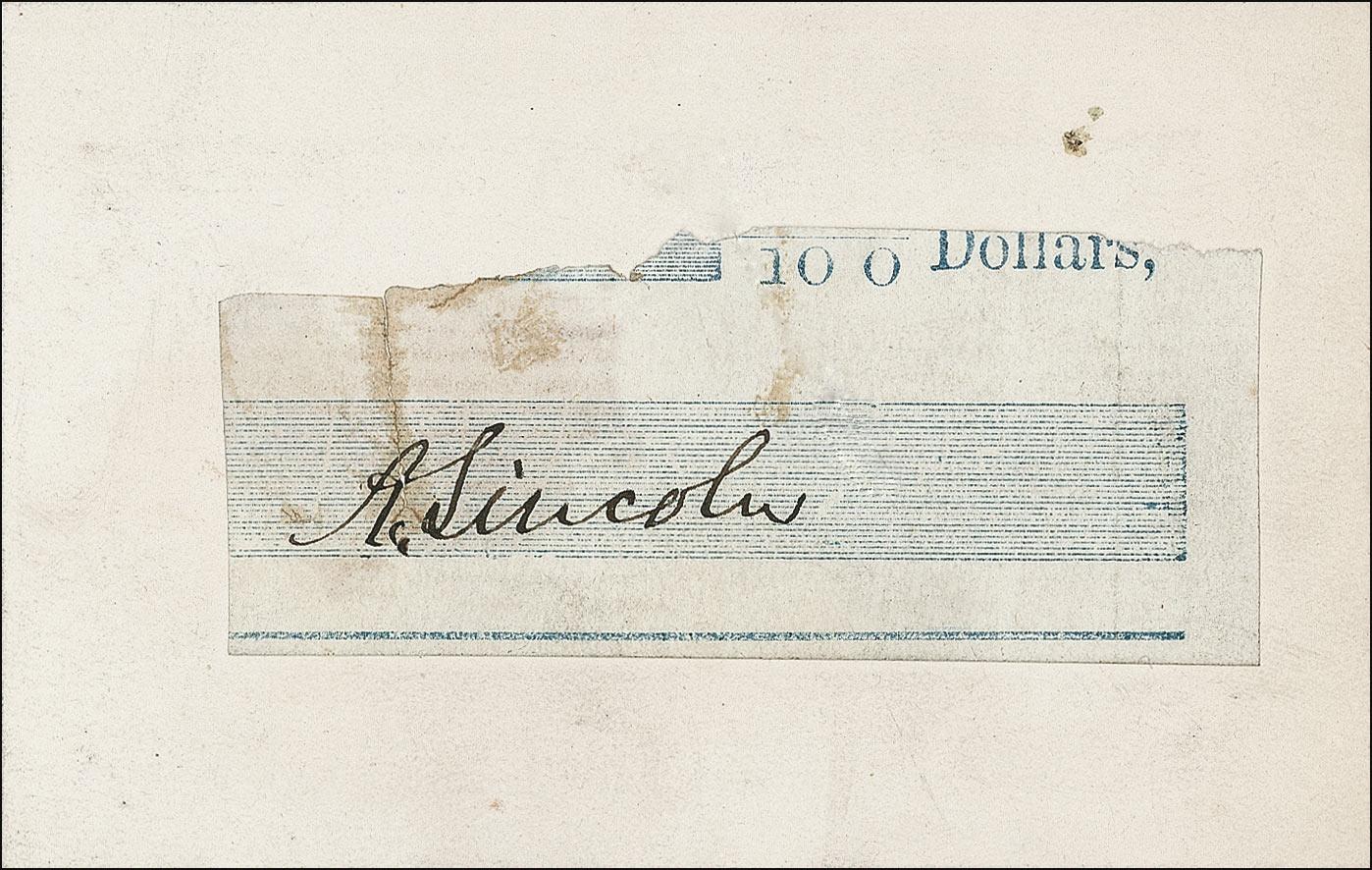 Ink signature, “A. Lincoln,” on an off-white 2.75 x 1.25 slip, clipped from a check. Slip is affixed to a 3.5 x 2.25 off-white card. A vertical crease through first initial, some scattered light toning, and an irregular top edge, otherwise fine condition. A clear and legible signature in an uncommon format. Pre-certified John Reznikoff/PSA/DNA and RRAuction COA.