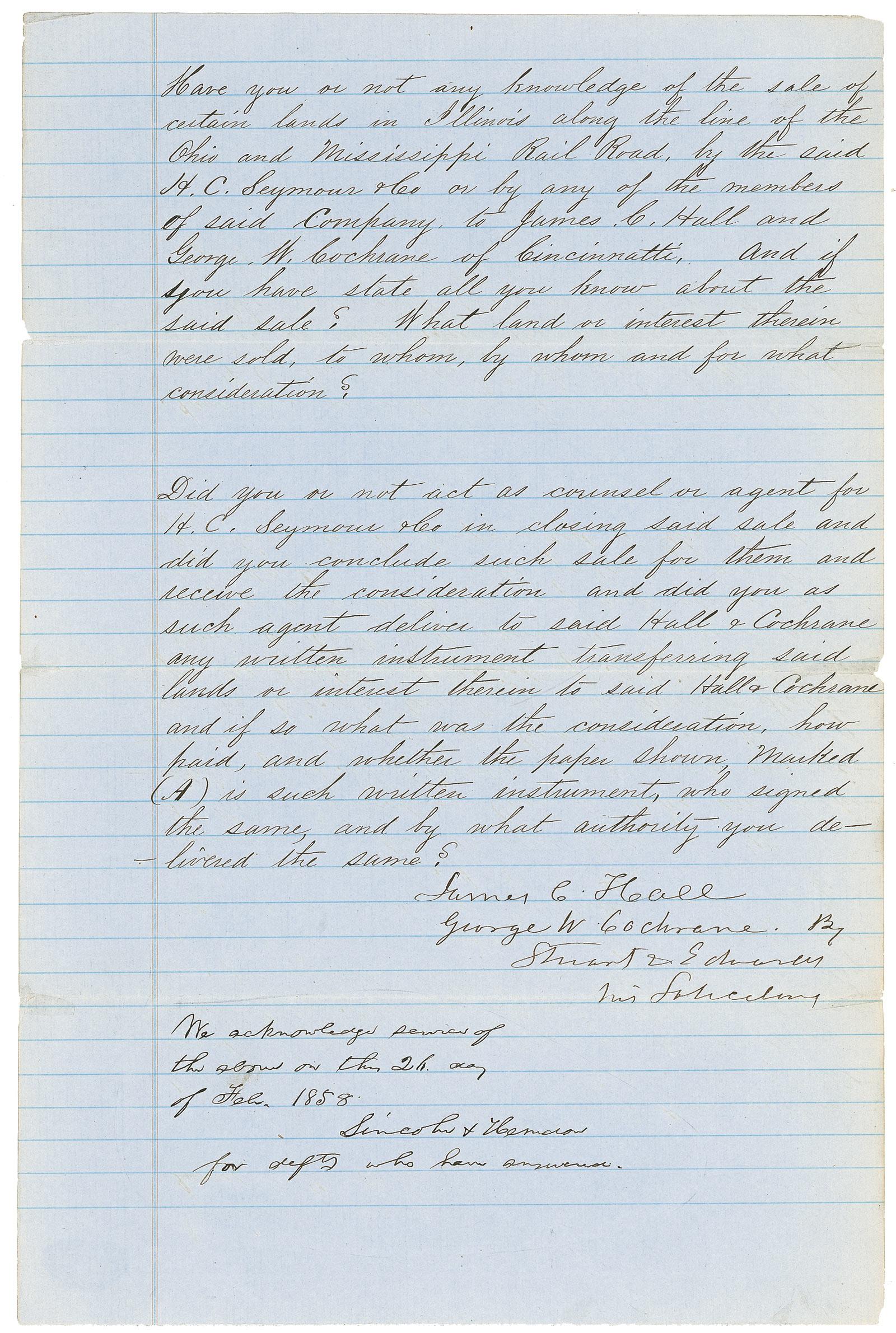 Handwritten endorsement, signed “Lincoln & Herndon,” at the bottom of an 8.5 x 12.5 lightly-lined one page manuscript document. Document concerns a plaintiff’s notice of application for dedimus (writ to commission individuals to act in place of a judge). At the conclusion in Lincoln’s hand, “We acknowledge service of the above on this 26th day of Feb. 1858. Lincoln & Herndon for defts. who have answered.” In fine condition, with light toning along edges and horizontal folds, and slight show-through from text on reverse. Pre-certified John Reznikoff/PSA/DNA and RRAuction COA.