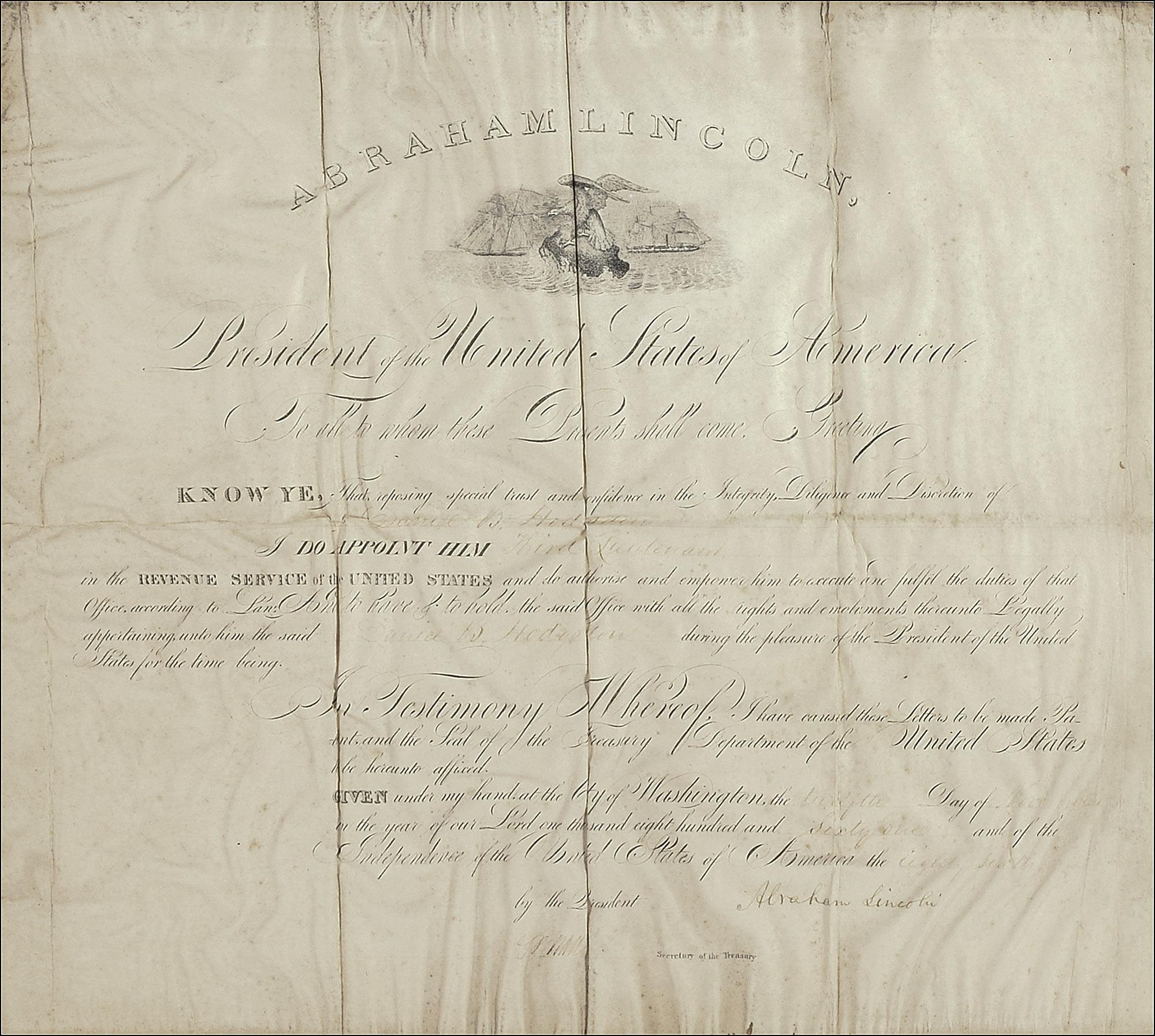 Hodgsdon’s service branch—the United States Revenue Cutter Service—was established in 1790 by Treasury Secretary Alexander Hamilton as an armed maritime law enforcement service. Originally seen as a group of waterborne tax collectors, members of the organization served in a variety of capacities, eventually morphing into the US Coast Guard. Around the time that Lincoln signed this appointment of Hodgsdon, revenue cutters were stationed at every major seaport of the nation, and used during the war to search for smugglers, protect US ports, and assist the Navy in logistical operations. This Lincoln-signed document marked the beginning of a long and distinguished career for Hodgsdon, a native New Yorker who quickly rose through the ranks during the war, reaching captain in 1868 and spending 36 years in the service. An unusual Lincoln appointment from a forgotten seafaring agency. Pre-certified John Reznikoff/PSA/DNA and RRAuction COA.