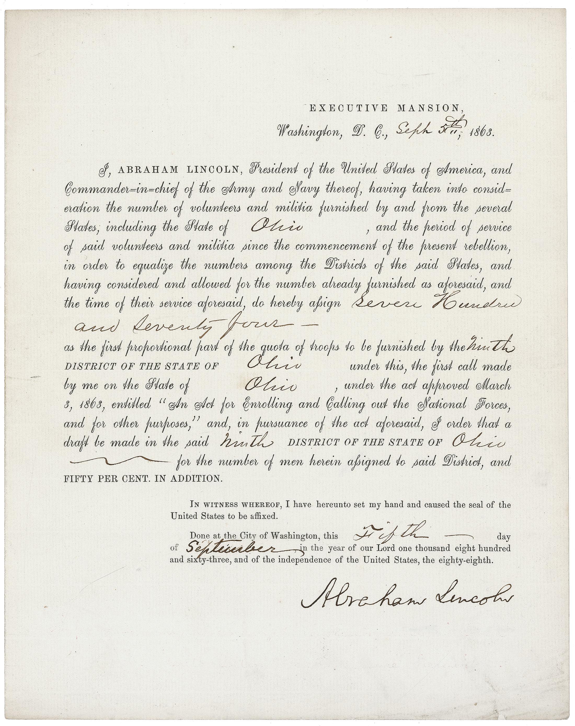 Partly-printed war-dated DS as president, one page, 7.75 x 10, September 5, 1863. Lincoln calls out Ohio men for military service. In full, “I, Abraham Lincoln, President of the United States of America, and Commander-in-chief of the Army and Navy thereof, having taken into consideration the number of volunteers and militia furnished by and from the several States, including the State of Ohio, and the period of service of said volunteers and militia since the commencement of the present rebellion, in order to equalize the numbers among the Districts of said States, and having considered and allowed for the number already furnished as aforesaid, and the time of their service aforesaid, do hereby assign Seven Hundred and Seventy-four as the first proportional part of the quota of troops to be furnished by the Ninth District of the State of Ohio under this, the first call made by me on the State of Ohio, under the act approved March 3, 1863, entitled ‘An Act for Enrolling and calling out the National Forces, and for other purposes,’ and in pursuance of the act aforesaid, I order that a draft be made in the said Ninth District of the State of Ohio, for the number of men herein assigned to said District, and fifty percent in addition.” In fine condition, with a trivial chip to bottom edge, a vertical diagonal crease to left side, some other light creasing and wrinkling, none affecting the impressive signature.
