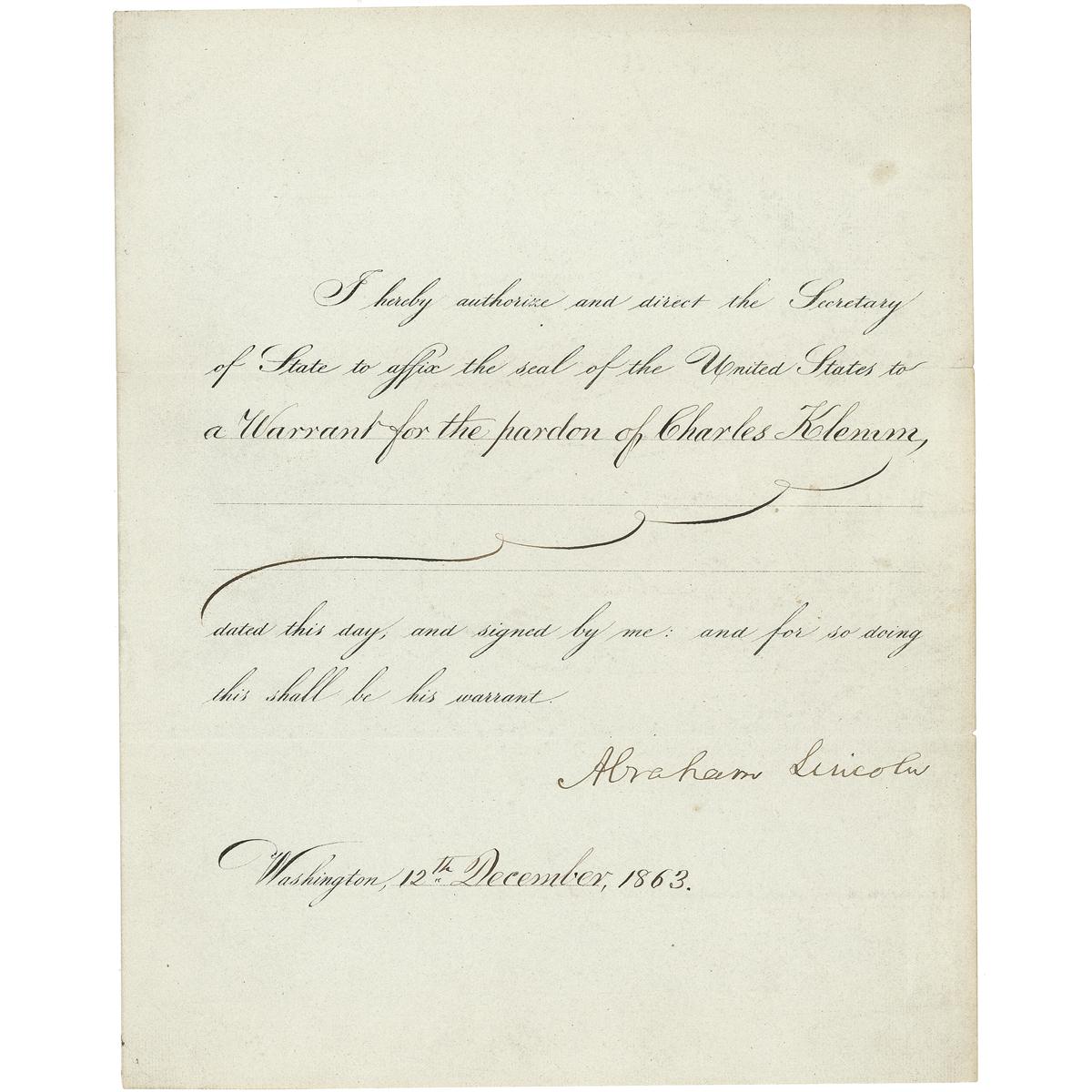 Partly-printed war-dated DS, one page, 8 x 10, December 12, 1863. Lincoln orders the secretary of state “to affix the seal of the United States to a warrant for the pardon of Charles Klemm.” Signed at the conclusion in full, “Abraham Lincoln.” In fine condition, with expected folds, a few trivial wrinkles, and just a hint of faint toning along extreme edges.