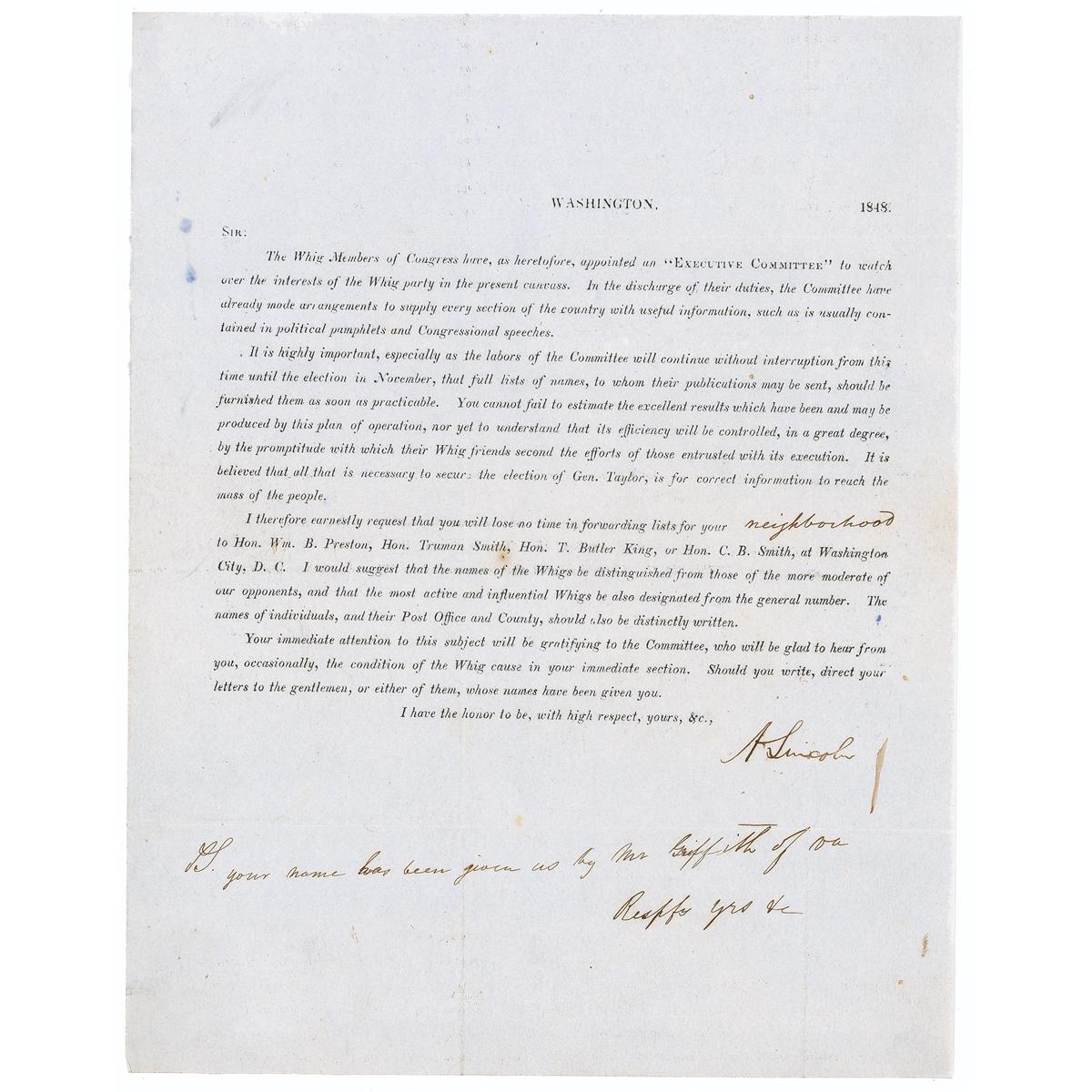Your immediate attention to this subject will be gratifying to the Committee, who will be glad to hear from you, occasionally, the condition of the Whig cause in your immediate section. Should you write, direct your letters to the gentleman, or either of them, whose names have been given you.” Beneath Lincoln’s signature is a postscript in another hand: “Your name has been us by Mr Griffith of VA.”